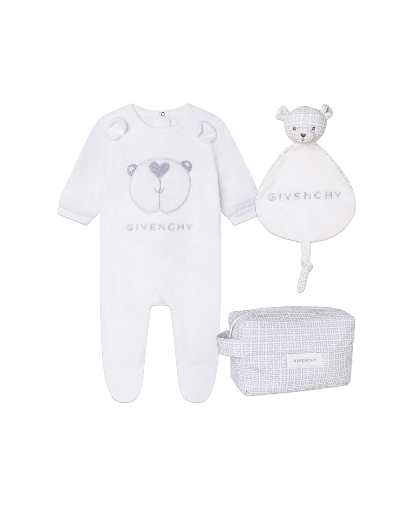 GIVENCHY Kids set for newborns consisting of a white doudou with grey 4G pattern and white pajamas with the GIVENCHY signature, covered feet, snap button closure and bear face embroidered on the front with cute applied ears. Set completed by a white pouch with zip, handle, logo label and all-over gray 4G motif.