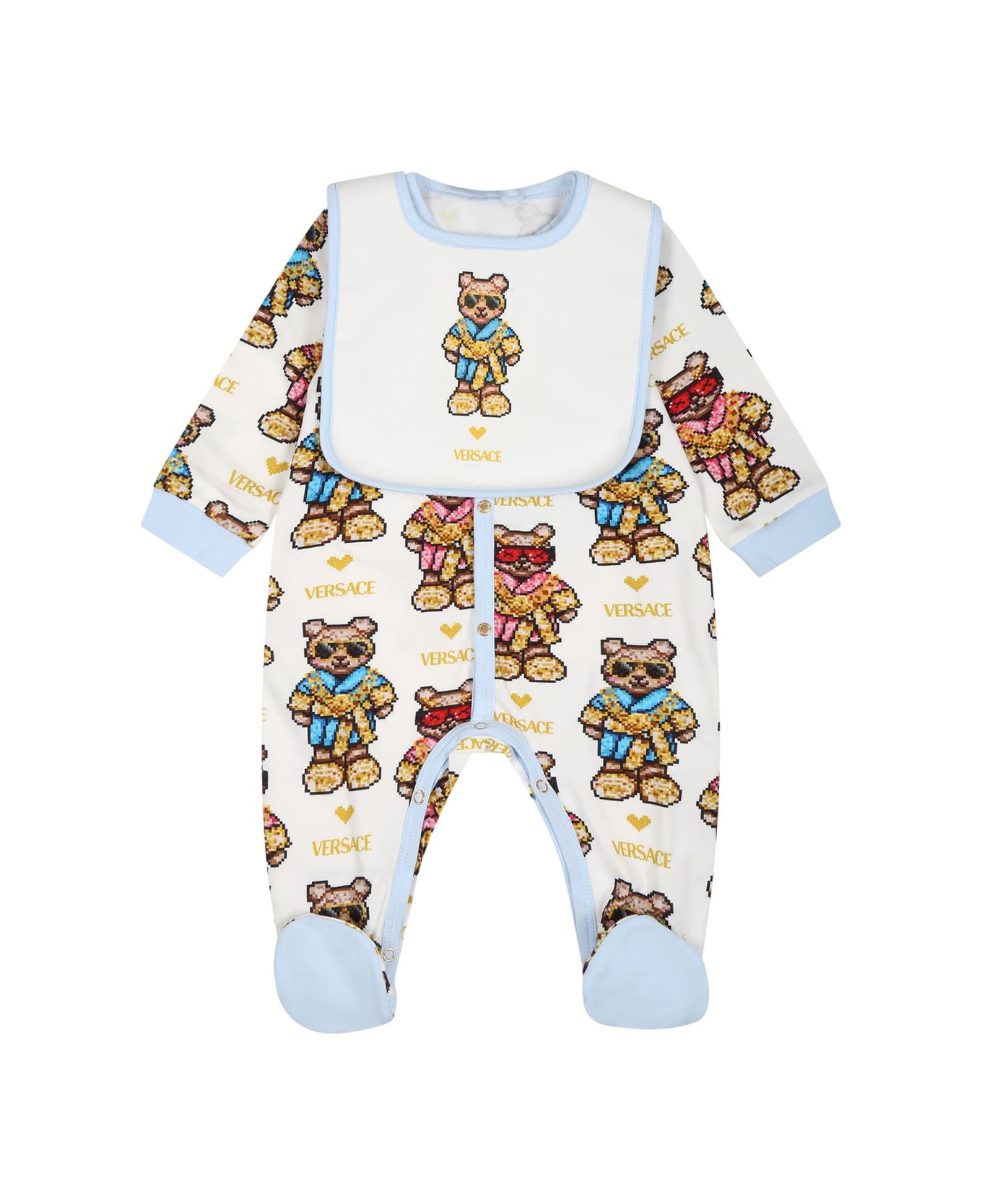 White set in cotton jersey, composed of babygrow and bib; babygrow with long slevees, with crew neck, feet and front closure with press studs, it is embellished with Teddy Bear and all-over logo; bib with snap button closure on the back and light blue piping; it is embellished with Teddy Bear and logo, on the front.