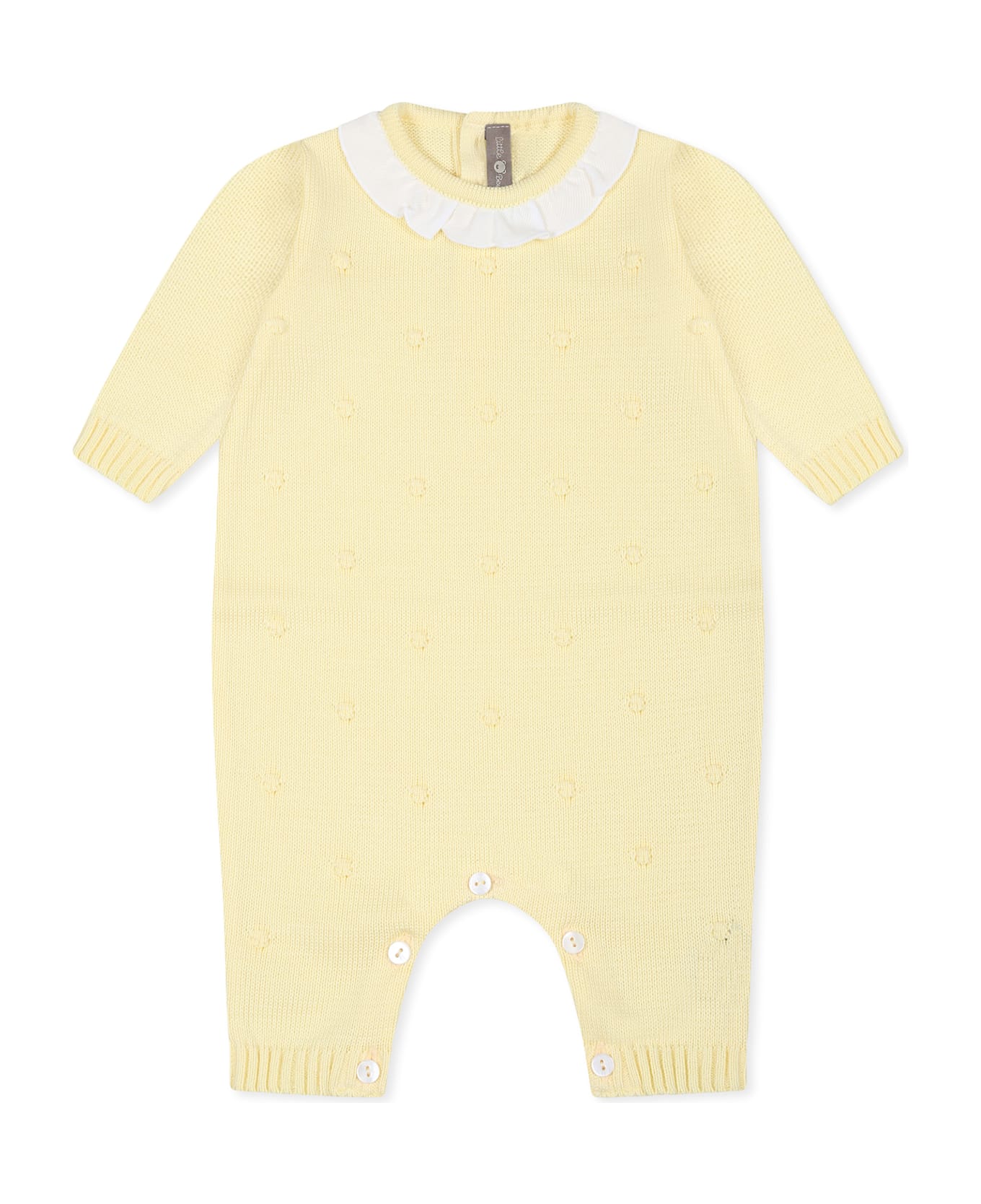 Yellow cotton babygrow, long sleeves, with a white ruffle crew neck, mother-of-pearl buttons on the back and between the legs, ribbed cuffs and ankles. It is embellished with polka dots embroidered on the front.