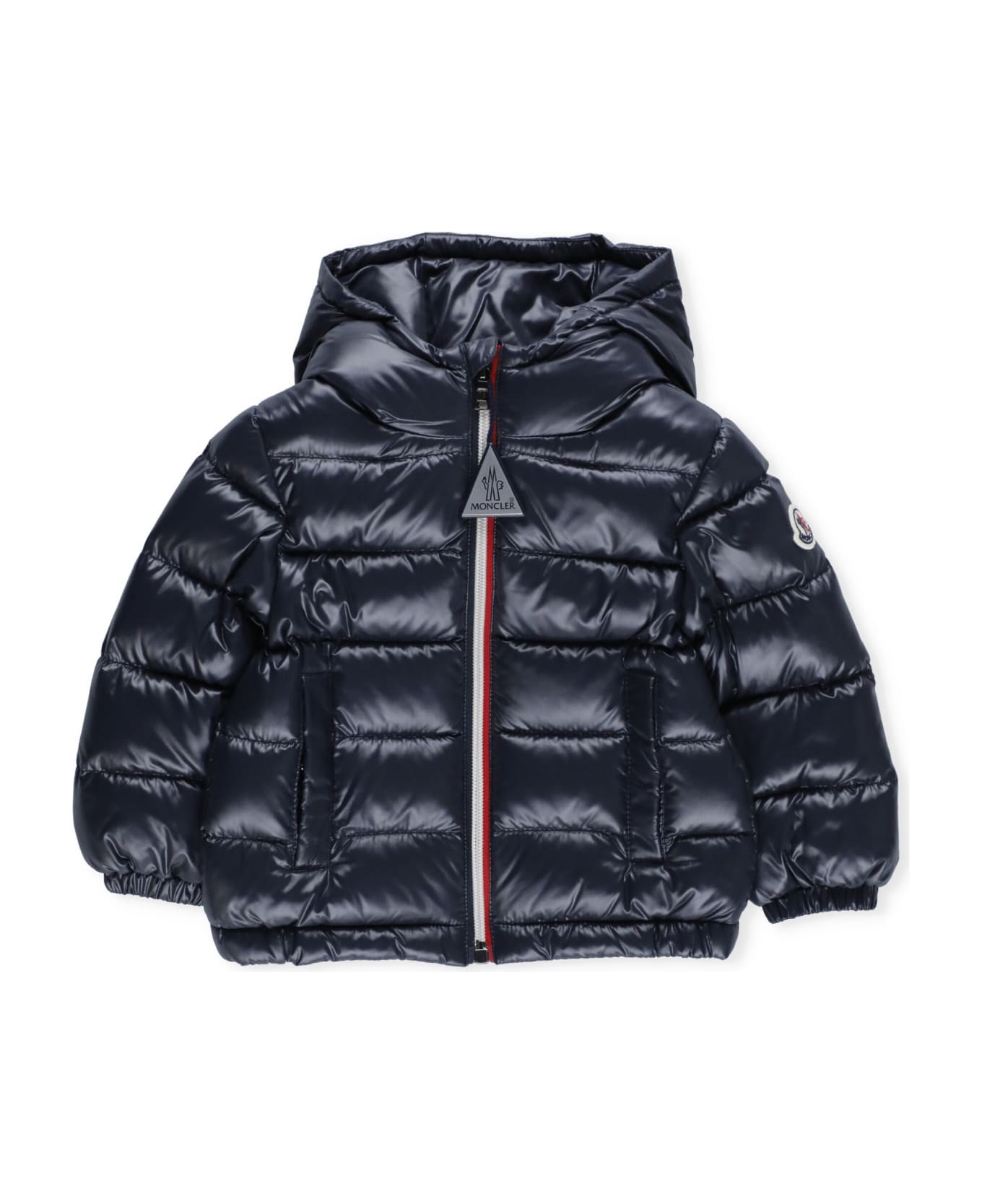 - Blue Moncler Baby nylon down jacket for boy - Hood - Long sleeves - Front zip fastening - Two side slit pockets with stud button fastening - Embroidered Moncler patch at left sleeve Composition: 100% Polyamide Filling:, 90% Down, 10% Goose Feathers