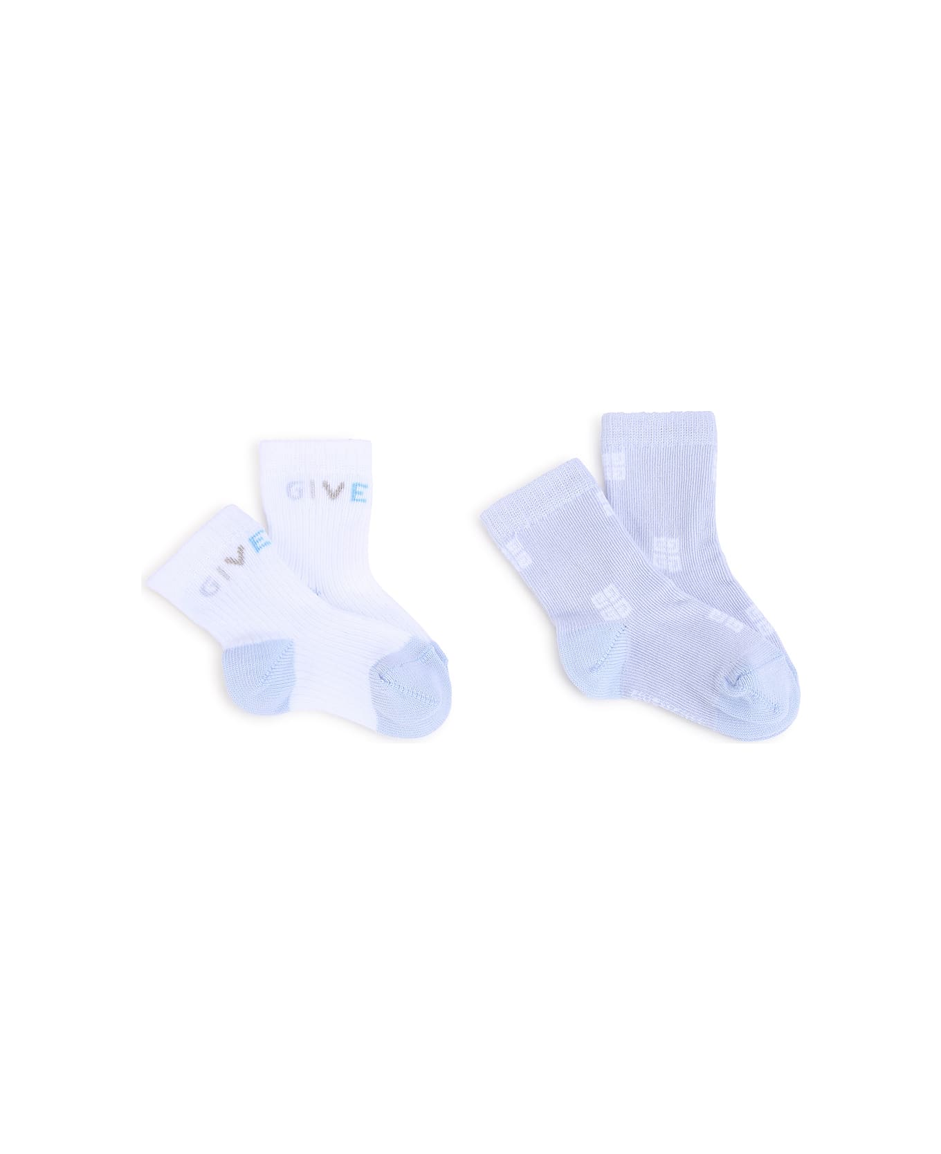 A set of two pairs of GIVENCHY Kids socks for baby boys consisting of one pair of light blue stretch cotton blend socks with contrasting 4G pattern and one pair of white stretch cotton blend socks with multicolored GIVENCHY logo.