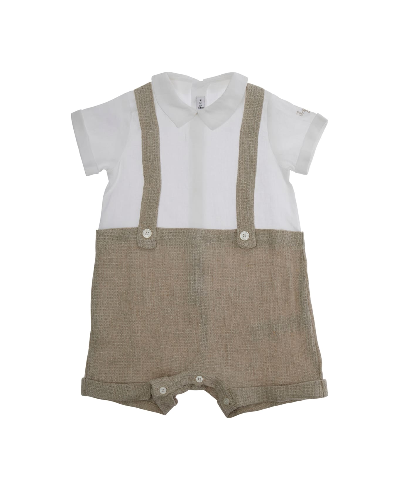 Beige One-piece With Shirt With Classic Collar And Dungarees With Buttons In Linen Baby