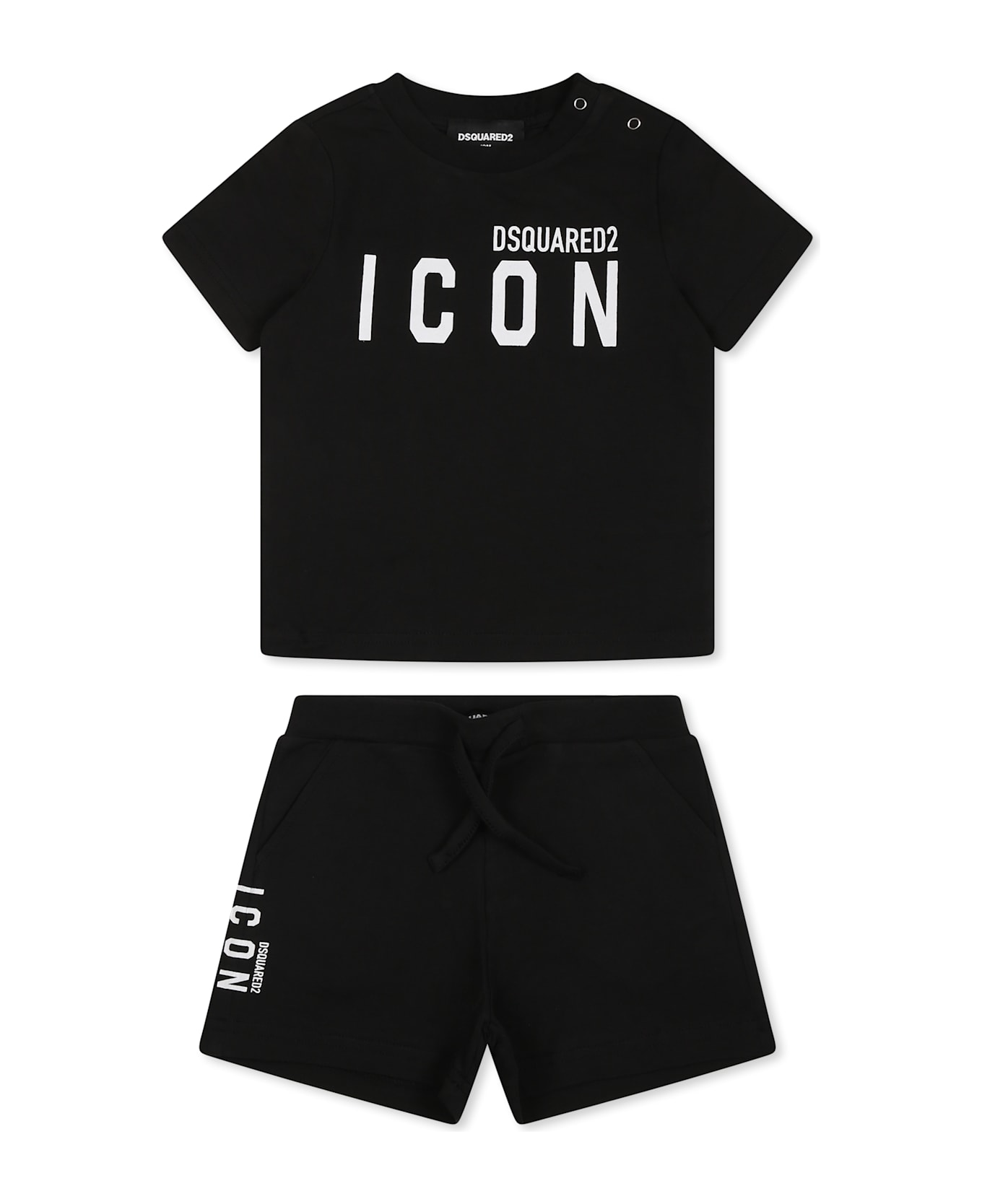 Black cotton set composed of t-shirt and shorts. Short-sleeved T-shirt with ribbed crew neck and hem and snap fastener at shoulder. Blackshorts with elasticated waist, drawstring and side pockets. Embellished with white logo.