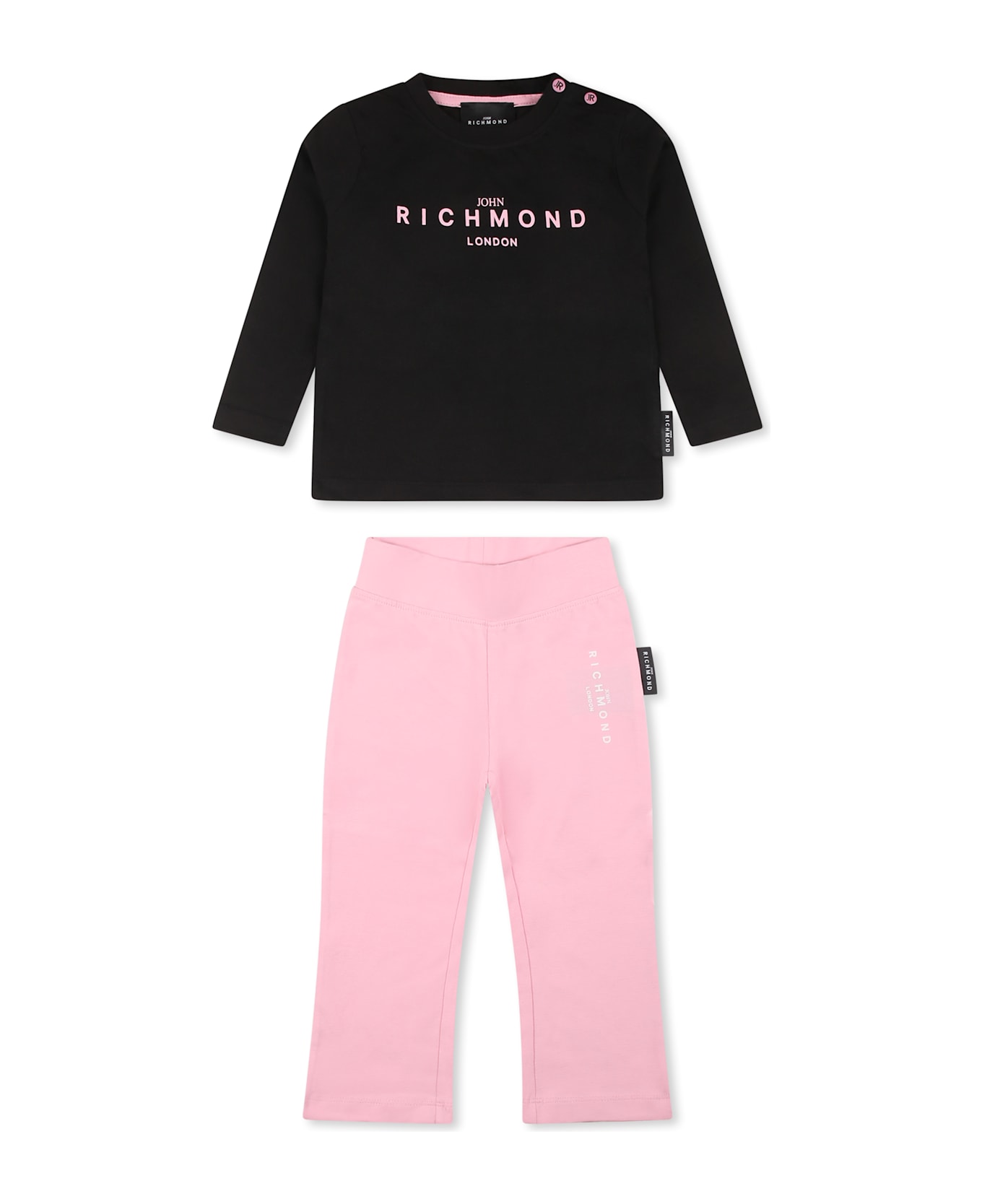 Black cotton suit, composed of a t-shirt and leggings. Black long-sleeved t-shirt, with a ribbed crew neck and snap button fastening on the shoulder; it is embellished with a pink logo on the front and back. Pink flared leggings, with an elasticated waist; they are embellished with a logo on one leg and a side logo patch.