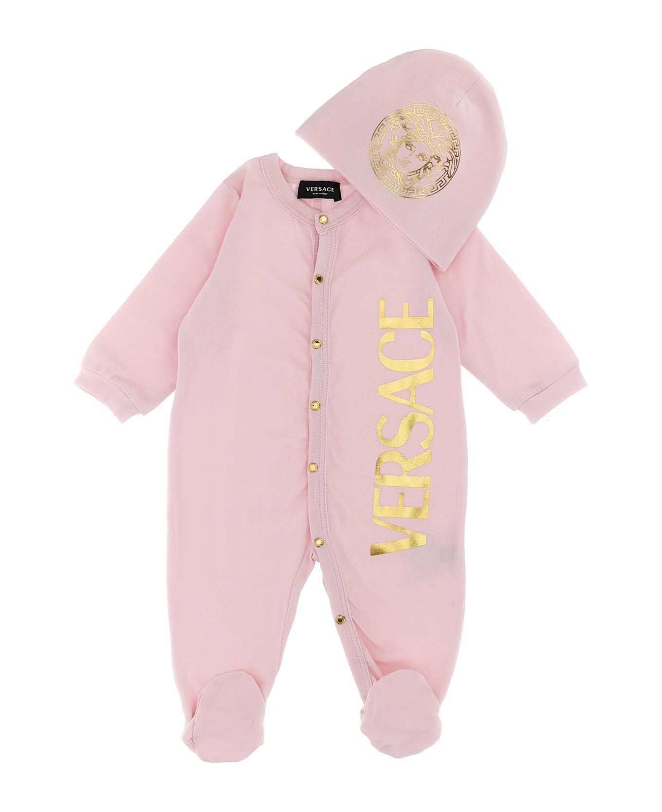 Cotton baby set with prints consisting of hat and bodysuit with front snap button closure, crew neck, long sleeves with cuffs, leg with foot. Composition: 94% cotton 6% elastane