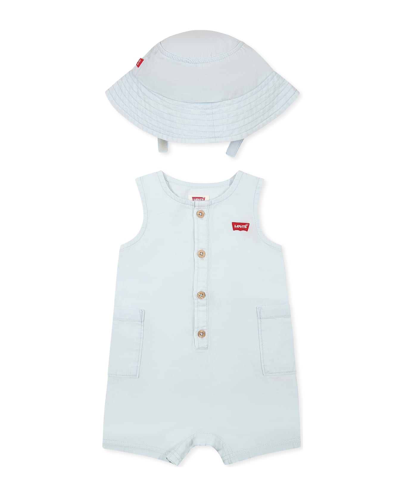 Light blue denim romper set, in cotton, composed of a romper and a cloche. Sleeveless romper, front closure with buttons, snap buttons between the legs, side pockets, matching cloche with velcro closure. It is embellished with a logo patch.