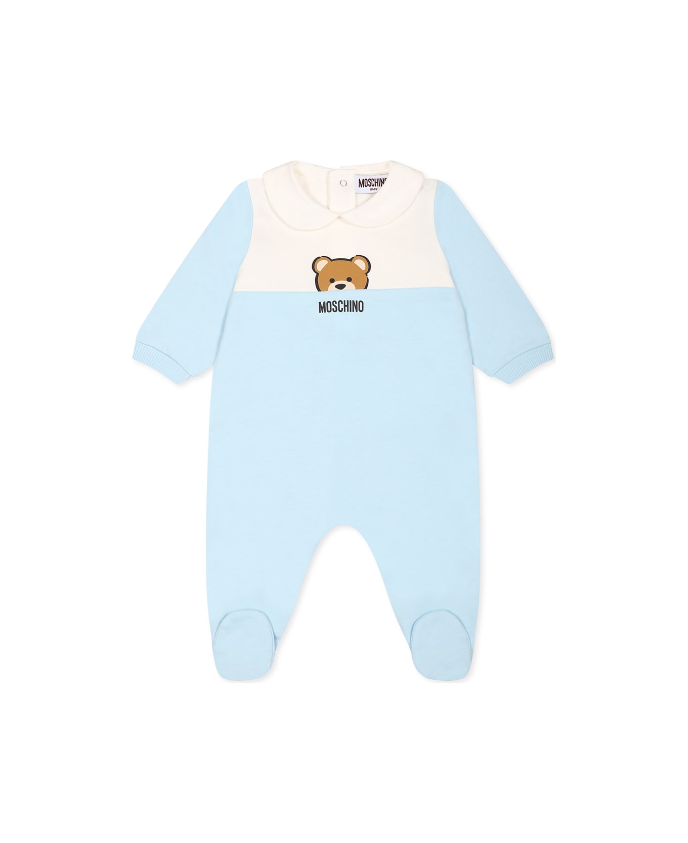 Light blue babygrow from the Moschino Kids brand, made of brushed organic cotton, with long sleeves, peter pan collar, feet, snap button closure on the back and between the legs, ribbed cuffs and feet. It is embellished with Teddy Bear and logo on the front.