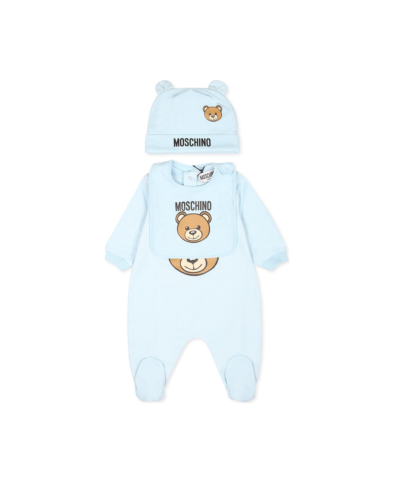 Light blue babygrow set from the Moschino kids brand, composed of a babygrow hat and bib. Babygrow in brushed cotton, long sleeves, with a peter pan collar, ribbed cuffs and snap button closure on the back. It is embellished with Teddy Bear and logo on the front. Hat with ears applied on the sides. It is embellished with a Teddy Bear print and black logo. Bib with side snap button closure, decorated with a Teddy Bear and black logo.