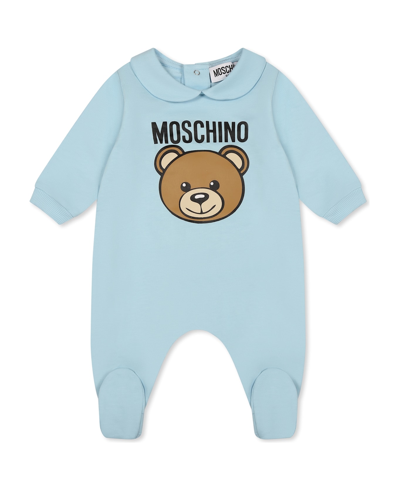 Light blue babygrow from the Moschino Kids brand, made of soft cotton jersey. Brushed cotton cotton babygrow with long sleeves, a peter pan collar, feet and a snap button closure on the back. It is embellished with Teddy Bear and logo on the front..