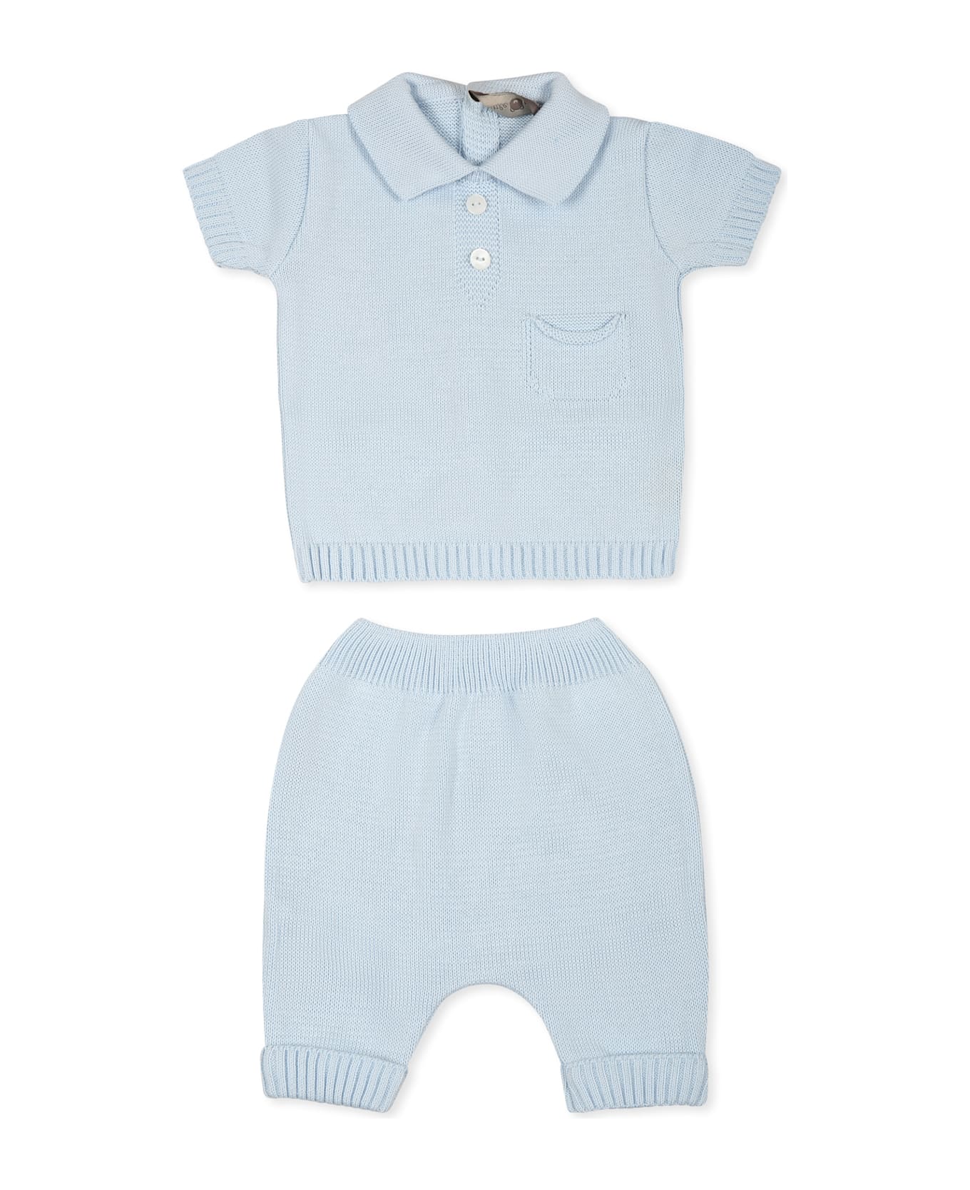 Light blue birth set in cotton thread, composed of a sweater and trousers; short-sleeved sweater, with pointed collar, mother-of-pearl button fastening on the back, buttons applied on the front, chest pocket, ribbed sleeves and hem; trousers with elasticated waist and cuffed ankles.