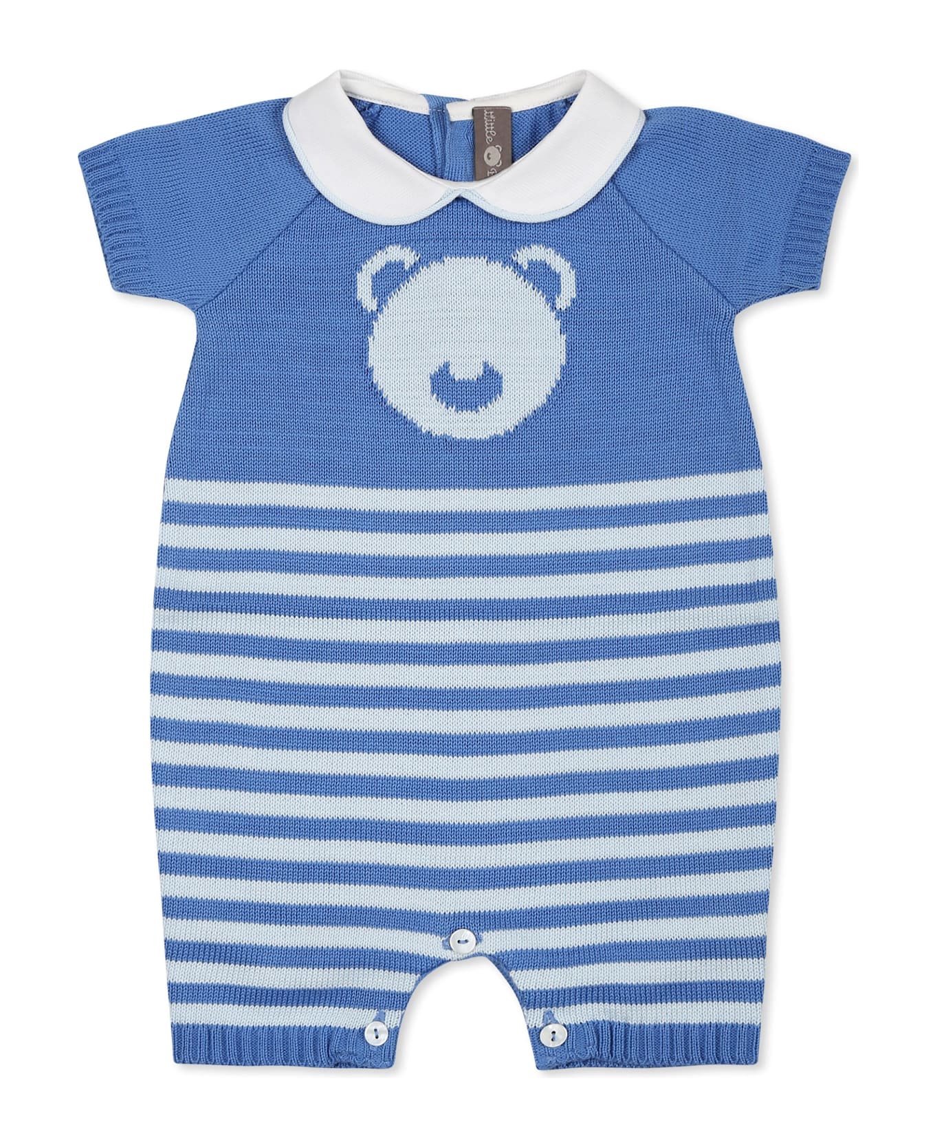 Light blue cotton romper, short sleeves, with cotton poplin peter pan collar, mother of pearl button fastening on the back and between the legs, light blue stripes on the front, ribbed sleeves and ankles. It is embellished with bear on the front.