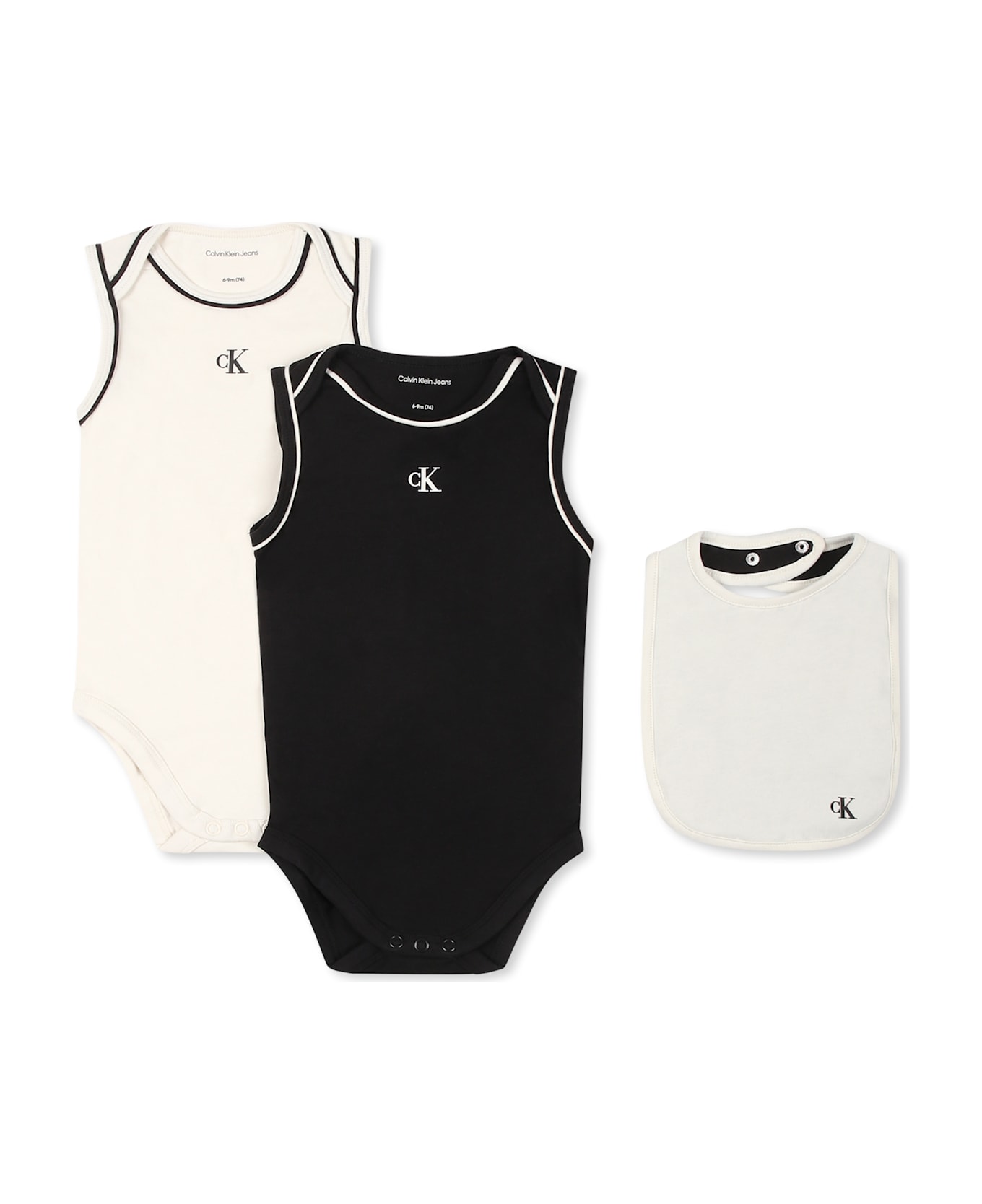 Multicolor body set in cotton blend, consisting of two bodies, ivory and black and bib. Sleeveless body, with crew neck, press studs between the legs and contrasting profiles; bib with press stud on the back. It is embellished with logo monogram.