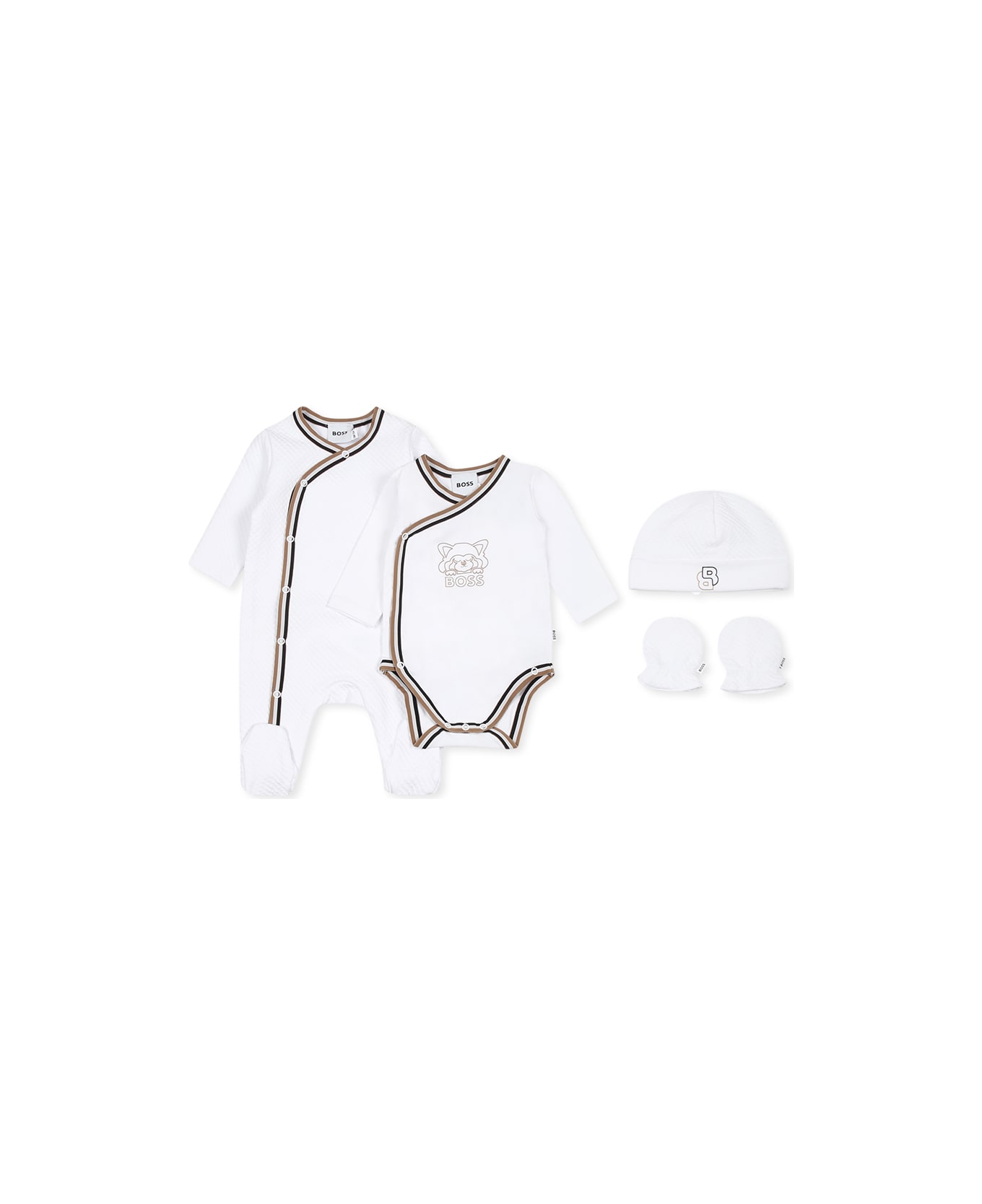 White babygrow set composed of a babygrow, bodysuit, hat and mittens. Heavy textured sleepsuit, long sleeves, crew neck, snap button front fastening, feet and tricolour details; embellished with BB logo on the cuff. Long sleeved bodysuit, crew neck, tricolour details, snap button fastening on the front and between the legs; embellished with logo and panda on the front. Hat with cuff; embellished with BB logo on the front. Mittens with elasticated hem.