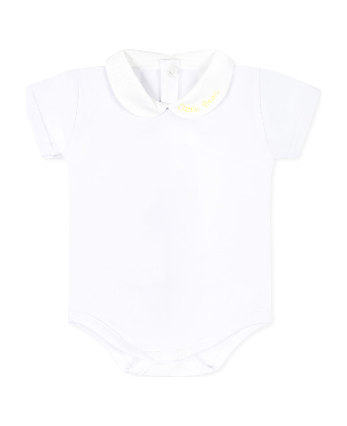 White cotton bodysuit, with short sleeves, peter pan collar, snap buttons on the back and between the legs. It is embellished with yellow logo embroidered on the collar.