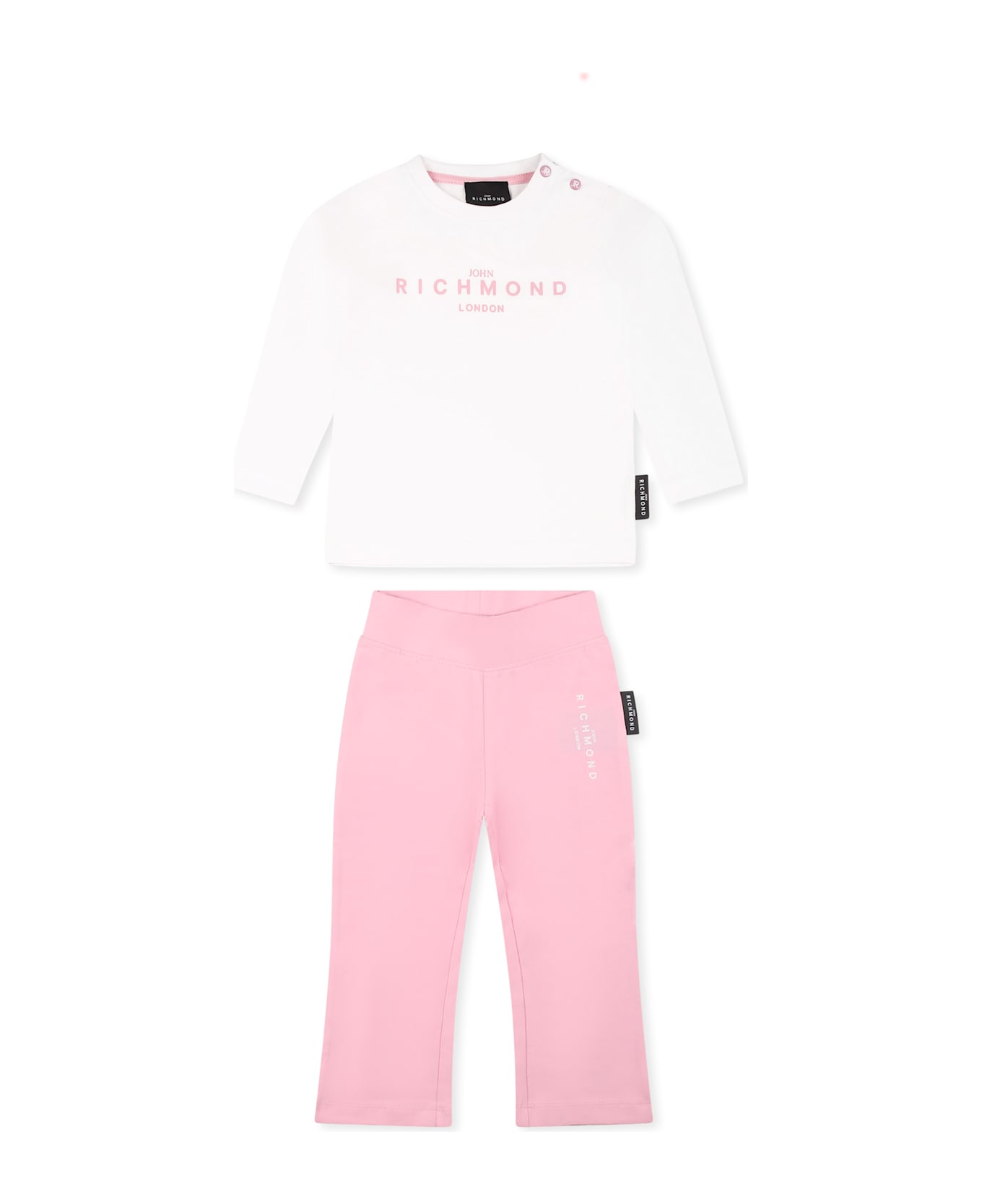 White cotton suit, composed of a t-shirt and leggings. White long-sleeved t-shirt, with a ribbed crew neck and snap button fastening on the shoulder; it is embellished with a pink logo on the front and back. Pink flared leggings, with an elasticated waist; they are embellished with a logo on one leg and a side logo patch.