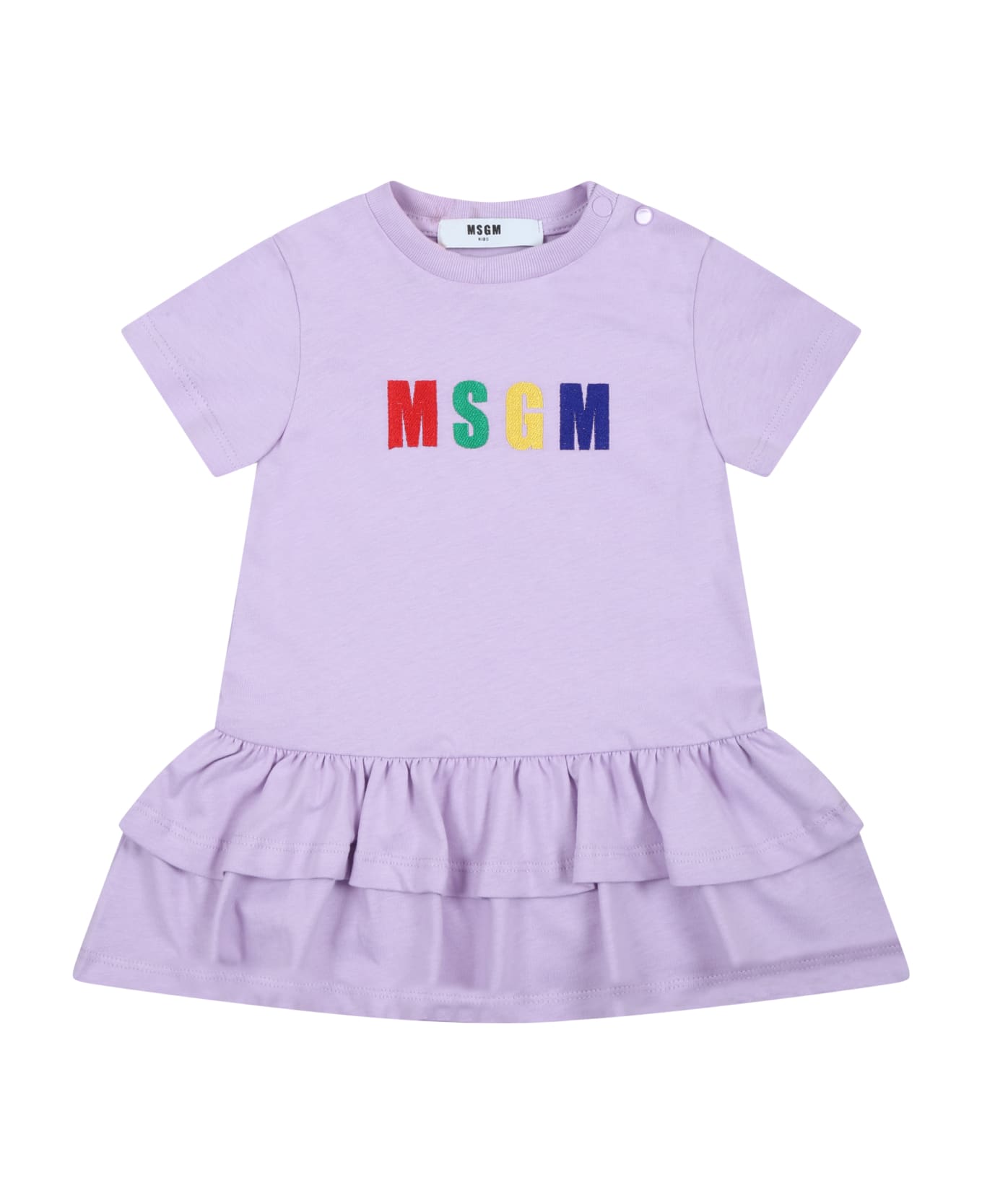 Purple dress in cotton, with short sleeves, ribbed crewneck, closure with automatic on the shoulder, rouches on the underside. It is embellished with multicolor embroidered logo on the front.