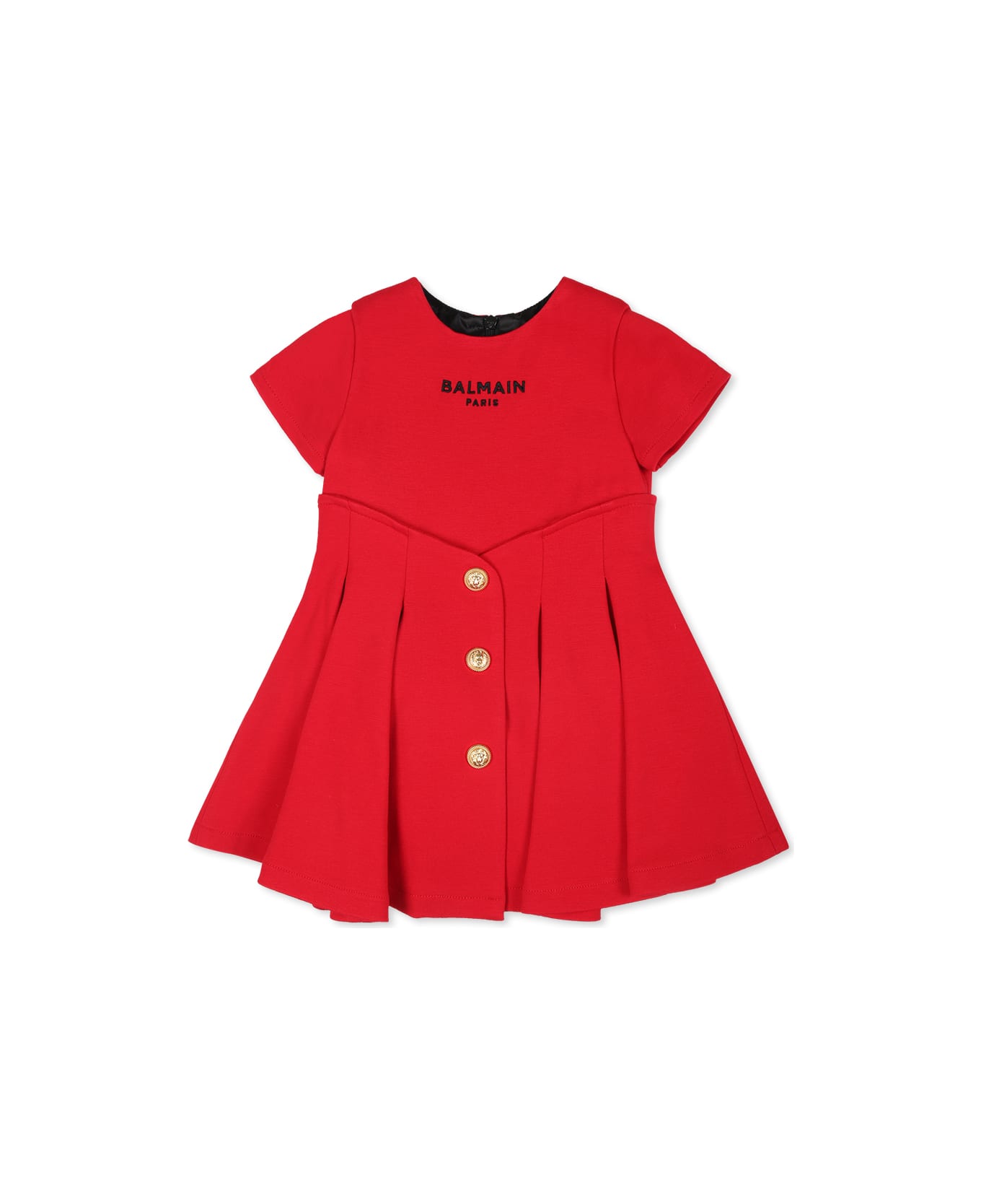 Elegant red dress, with short sleeves, round neckline, zip closure on the back, pleated skirt and black culotte. It is embellished with iconic gold buttons on the front and black logo embroidered on the chest.