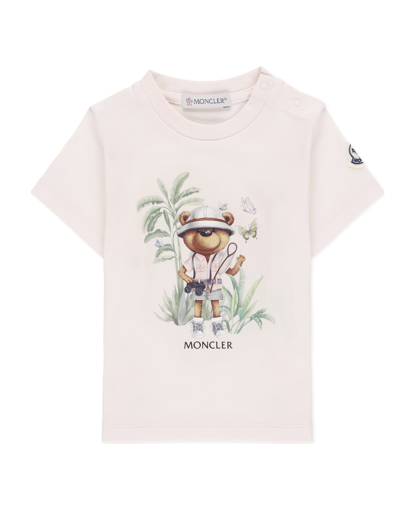 - Pink Moncler Baby cotton t-shirt for girl - Round neck with snap buttons - Short sleeves - Front contrasting color print - Iconic logoed patch on the left sleeve Composition: 92% Cotton, 8% Elastane