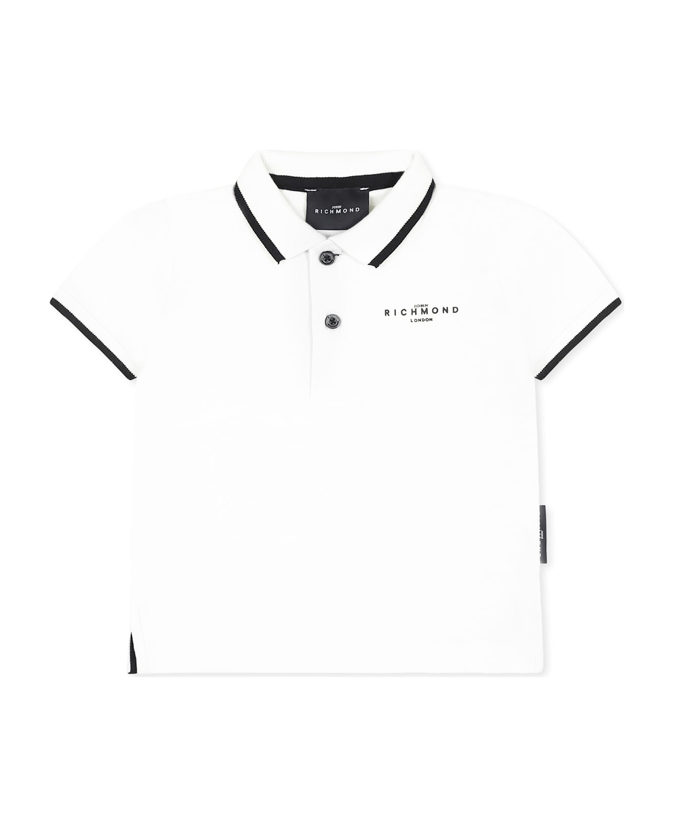 White cotton pique polo shirt, short sleeves, classic collar, front button fastening and black profiles. It is embellished with logo on the chest.