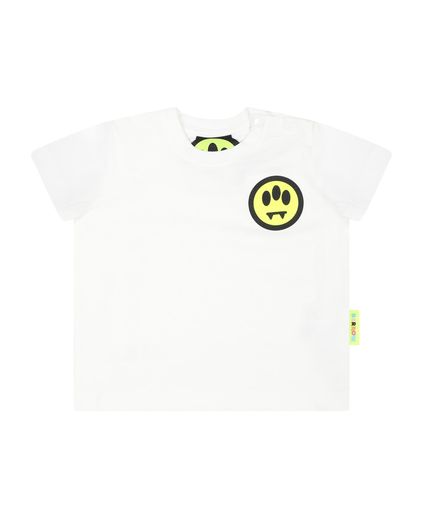 White cotton t-shirt with short sleeves and ribbed crew neck. It is embellished with iconic yellow smile on the chest and logo on the back. It is comes with a key ring.