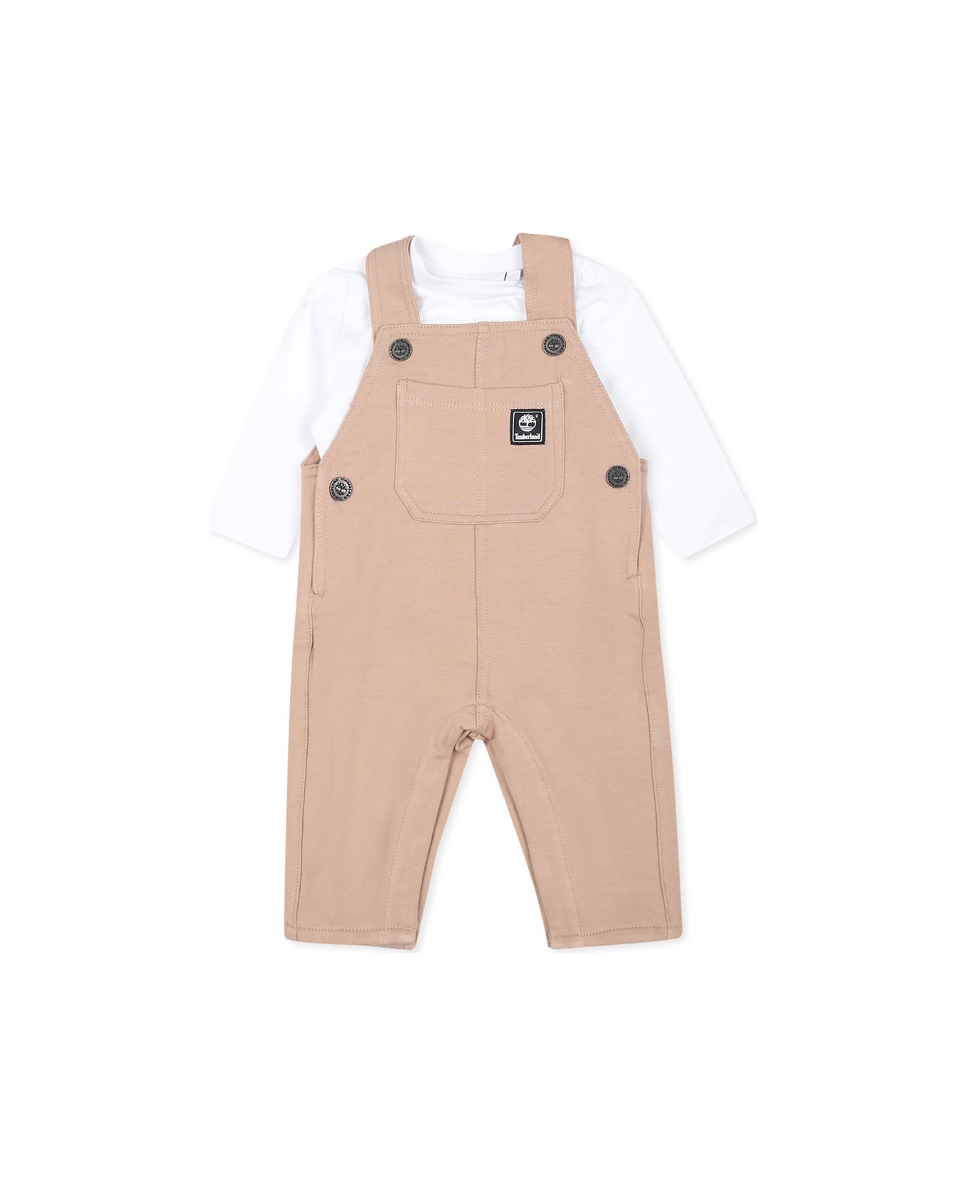 Beige organic cotton blend set, composed of a t-shirt and dungarees. White organic cotton t-shirt, long sleeves, ribbed crew neck and snap button fastening on the shoulder. It is embellished with front logo print. Beige fleece cotton overalls, with braces, snap button fastening on the front and sides, patch pocket on the front. It is embellished with a logo patch on the front.