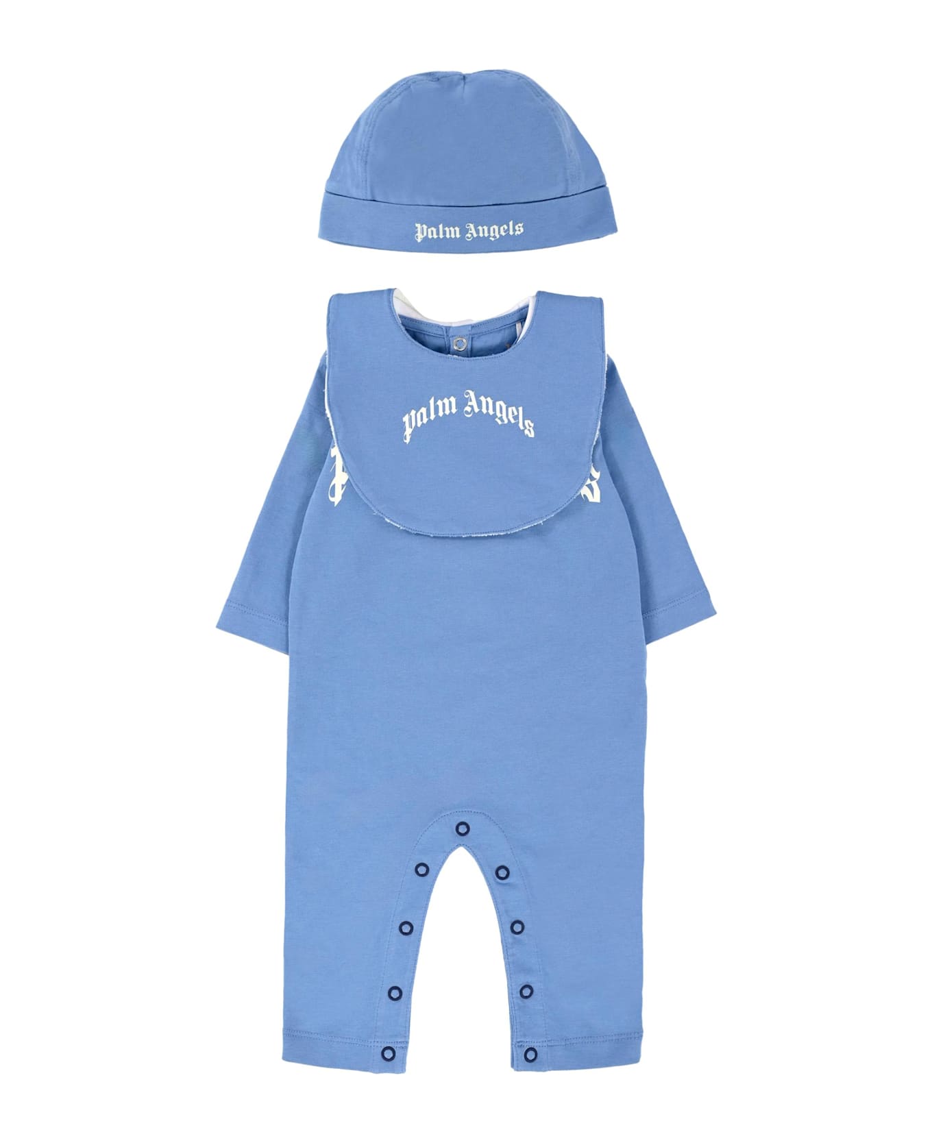 Light blue cotton babygrow set, composed of babygrow, hat and bib. Lightweight cotton babygrow, long sleeves, with white Peter Pan collar, snap button fastening on the back and between the legs; hat with cuff; bib with snap button fastening on the back. It is embellished with a logo print on the front.