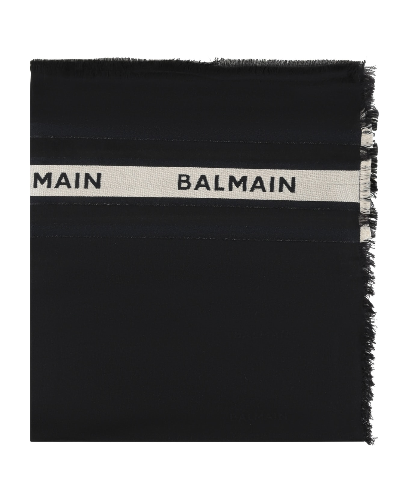 Black scarf in cotton with fringes on the edges. It is embellished with golden band and black logo on the front.