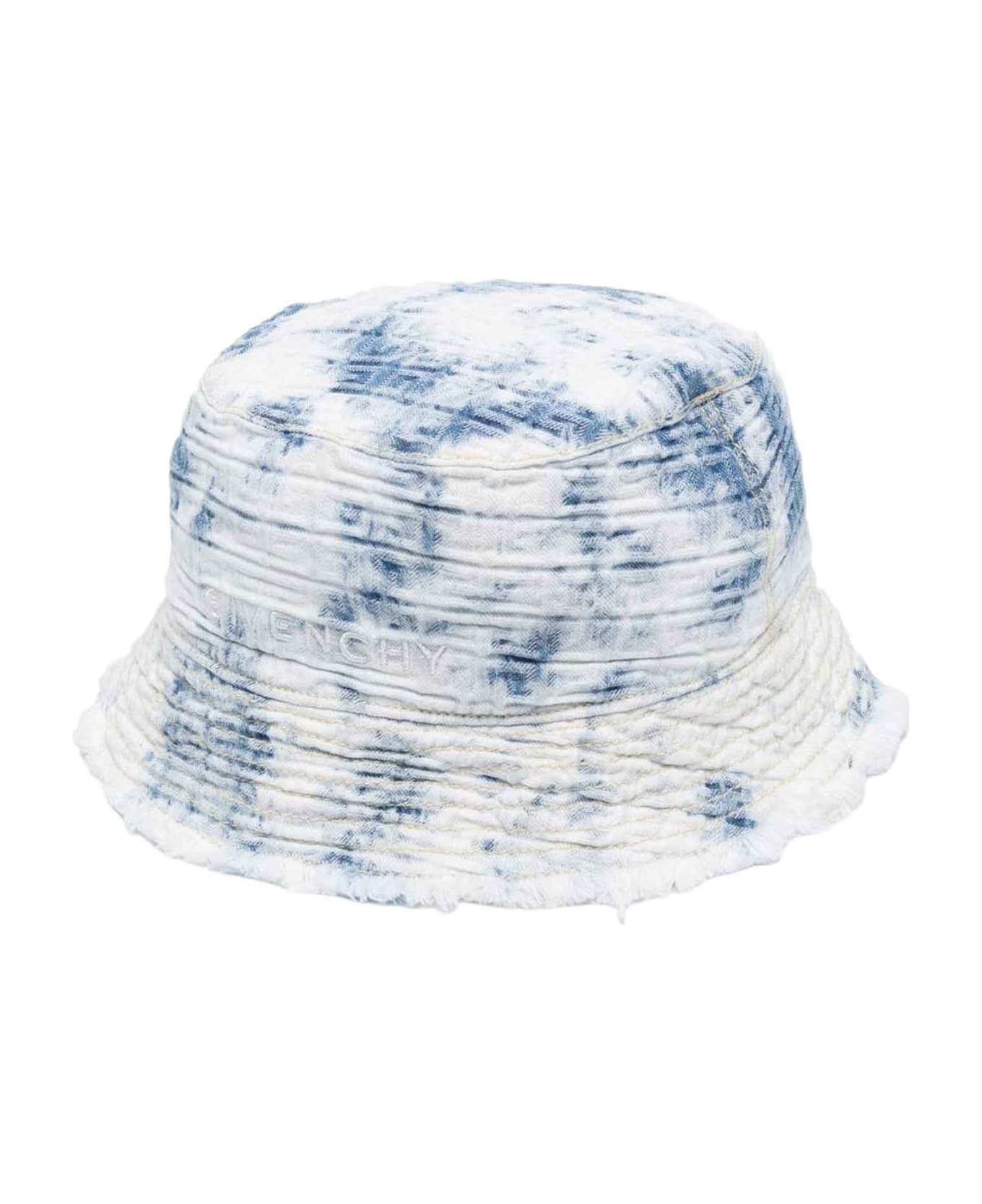 blue/white hat boy. Tie dye pattern, monogram motif, front logo embroidery, frayed details and low narrow brim. 100% Cotton