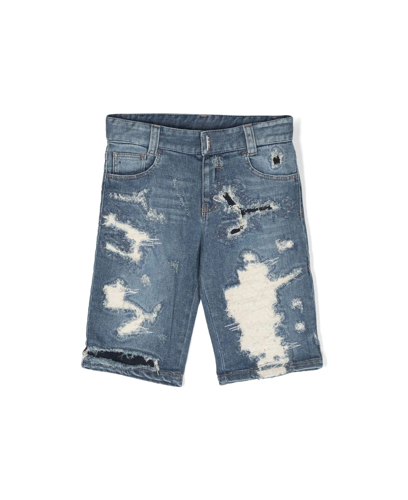 GIVENCHY Kids bermuda shorts made from blue destroyed denim with belt loops, GIVENCHY tag, 4G metal rivets on the back, GIVENCHY metal barrette fastening, two side pockets on the front, two patch pockets on the back and 4G destroyed effect logo on the back left pocket.