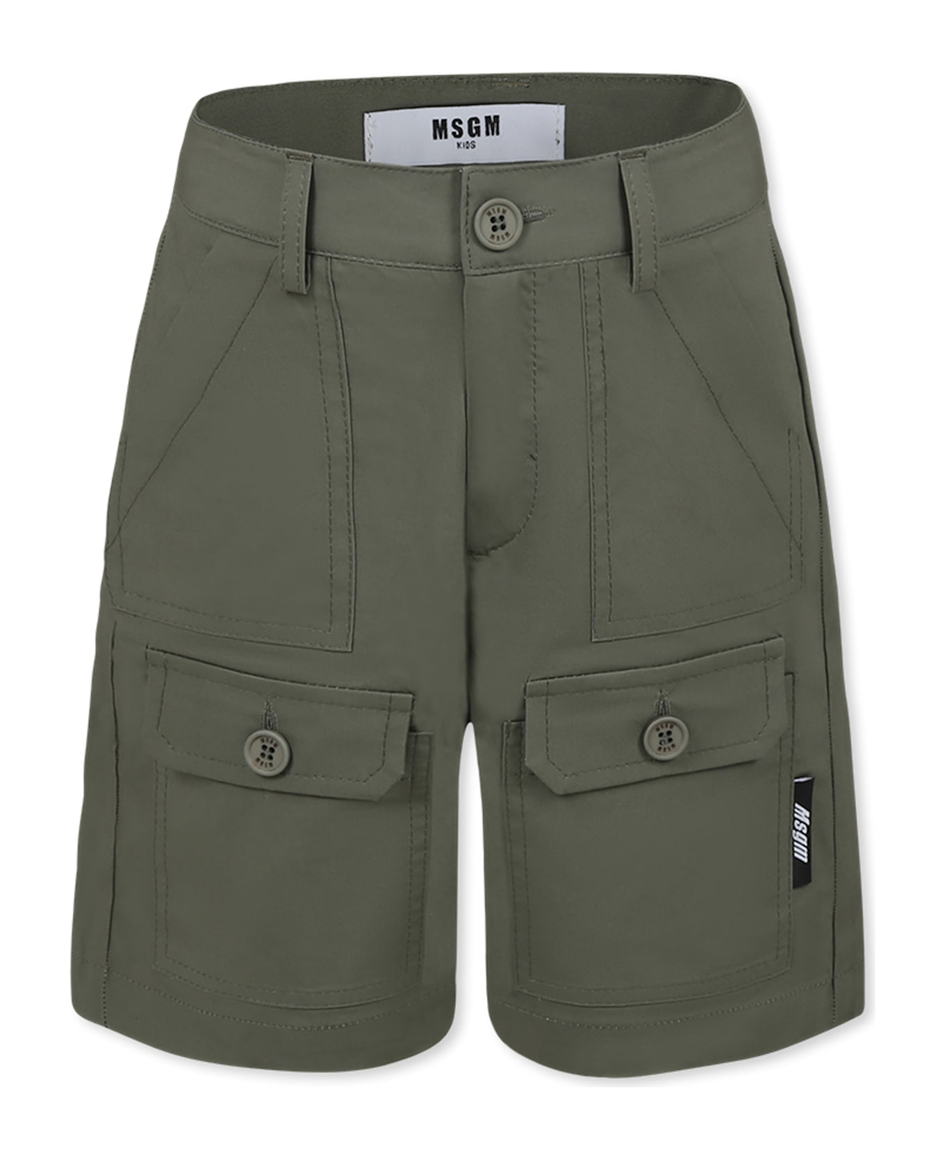 Green cotton blend shorts with belt loops, zip and button front fastening, adjustable waist with internal elastic with buttons, side pockets, back pockets and flap and button pockets on the front. They are embellished with a logo patch on the front.