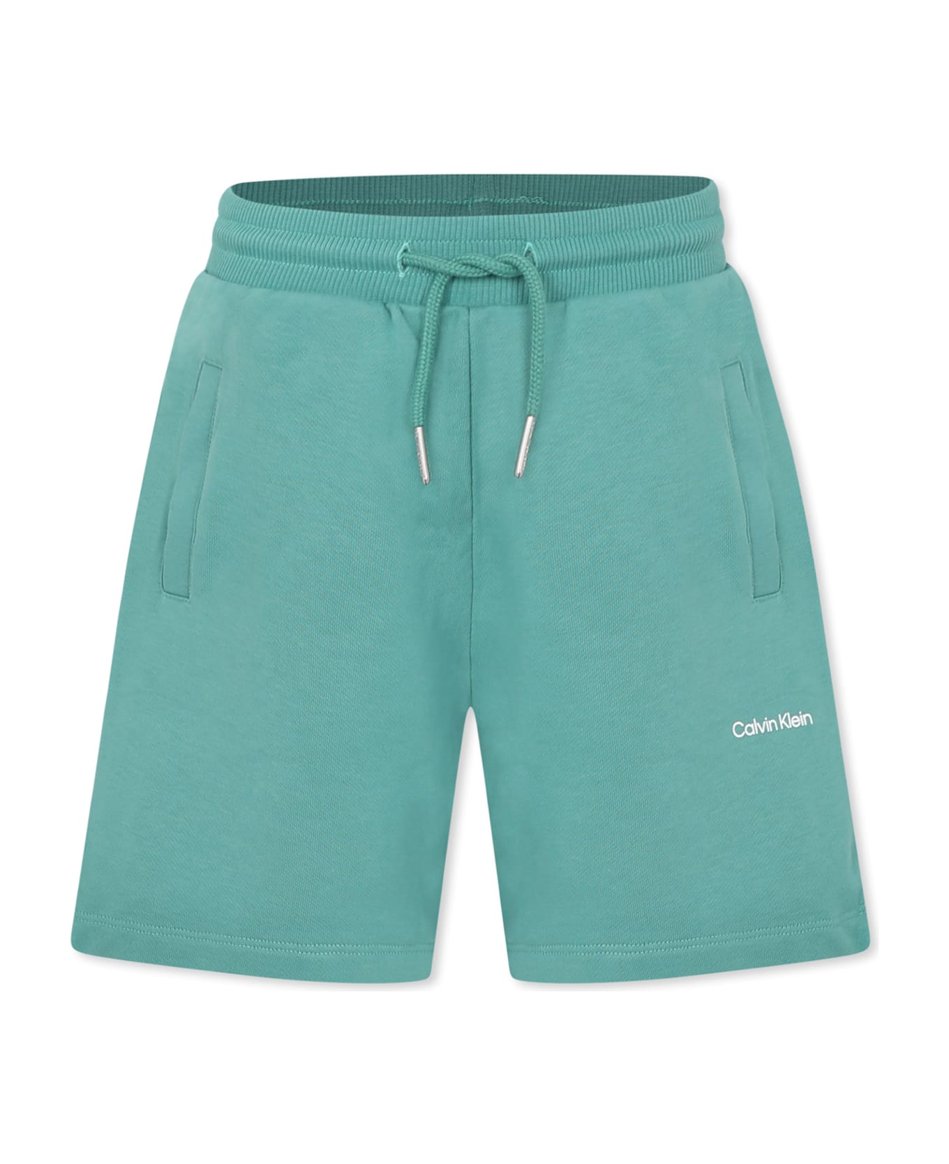 Green shorts in brushed cotton, with elasticated waist, drawstring, side pockets and back pocket. They are embellished with a logo on one leg.