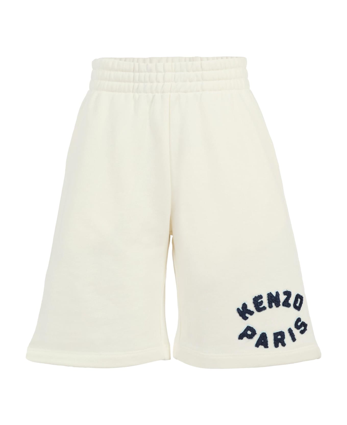 Ivory shorts in organic cotton, with elasticated waist and side pockets. They are embellished with a blue logo, embroidered on one leg.