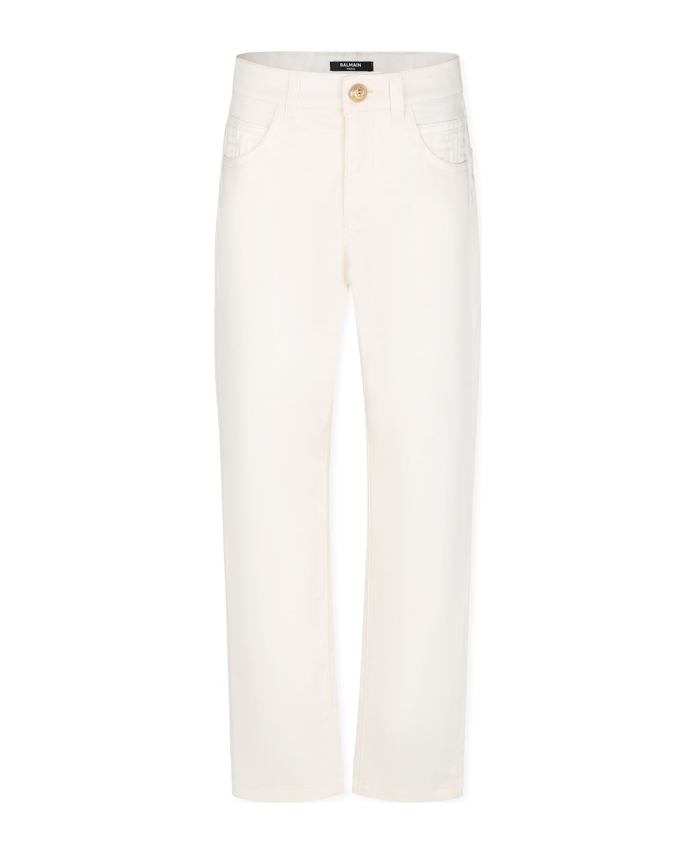Ivory cotton blend trousers with belt loops, front zip fastening with iconic gold button, side pockets and back pockets. They are embellished with iconic maze on the front.