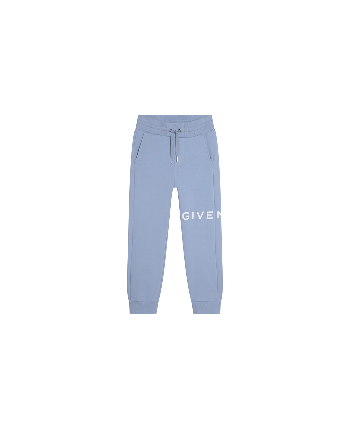 GIVENCHY Kids joggers made of a light blue cotton blend and featuring a drawstring waist, two side pockets, white GIVENCHY logo on the side and white 4G logo printed on the back pocket.