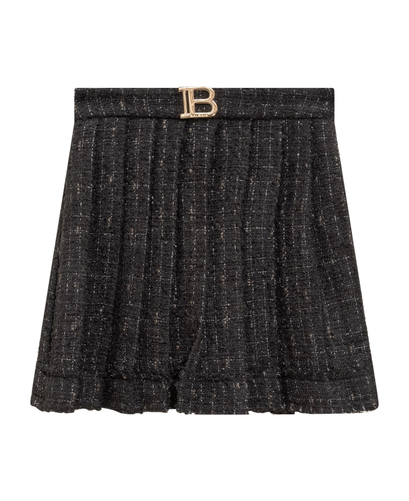 Black mini skirt. Closure with zip. Golden metal logo on the front. Pleated. Composition: Outside:, 42% Acrilico, 22% Cotton, 15% Polyester, 13% Wool, 7% Polyamide, 1% Metallo Lining:, 100% Viscose