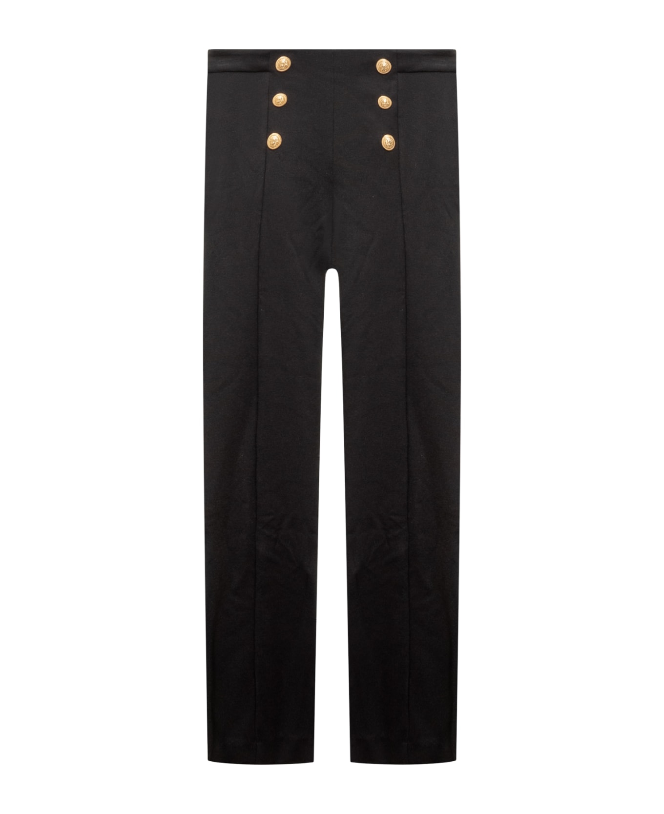 Black long trousers. Zip closure on the back. Gold buttons on the front. Composition: 68% Viscose, 28% Polyamide, 4% Elastane