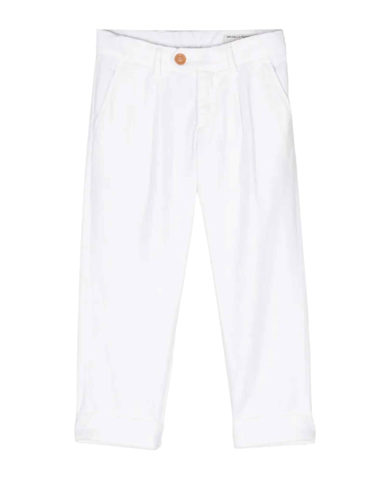 white trousers boy. Off center front button fastening, two front pouch pockets, two hidden back pockets, belt loops, straight cut and straight hem. Cotton 69%, Linen 29%, Spandex/Elastane 2%