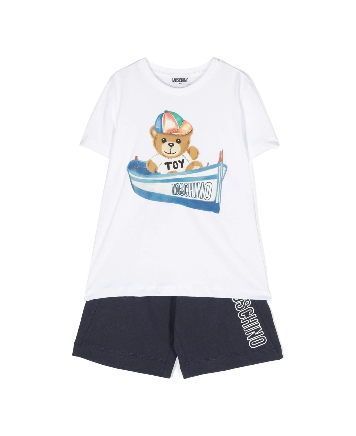 Moschino Kids set made of cotton and consisting of a pair of blue shorts with contrasting front lettering and a short-sleeved white t-shirt decorated on the front with Moschino Teddy Bear boat with logo print.