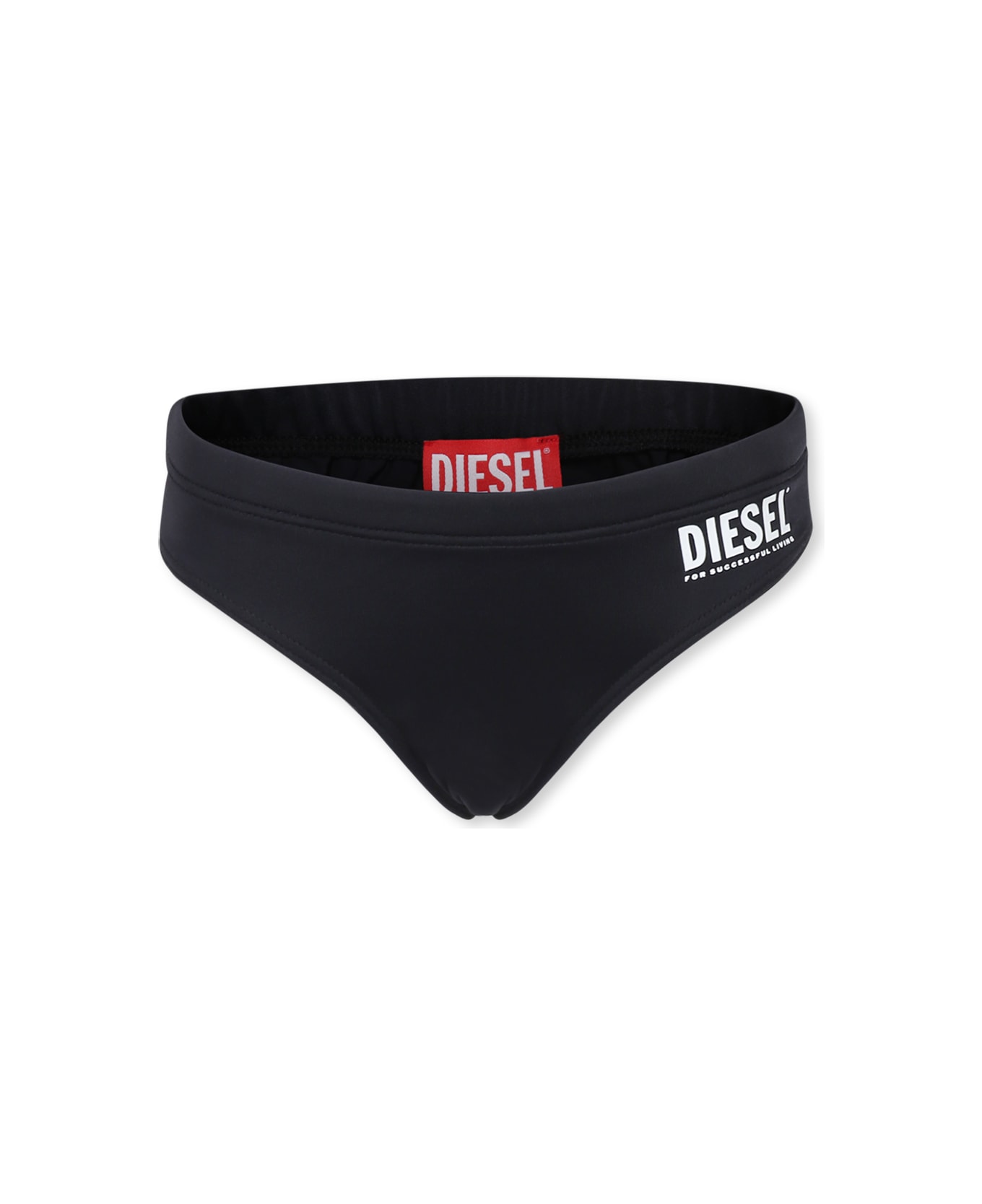 Black swim briefs, with elasticated waist; embellished with white logo on the front.