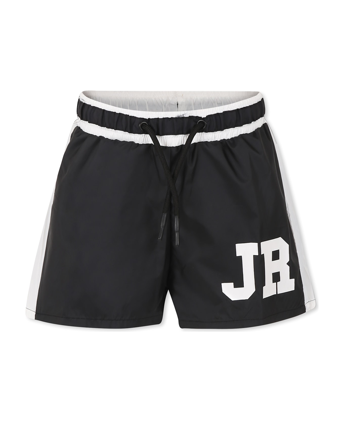 Black swim shorts with elasticated waist, drawstring and white side bands. They are embellished with logo on one leg.