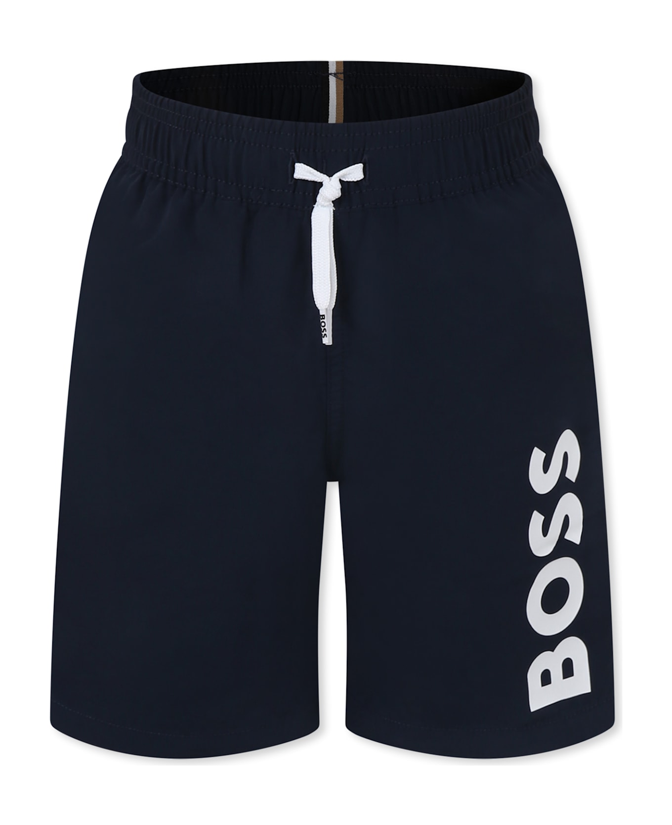 Blue swim shorts with elasticated waist, drawstring and side pockets. It is embellished with white logo print on one leg.