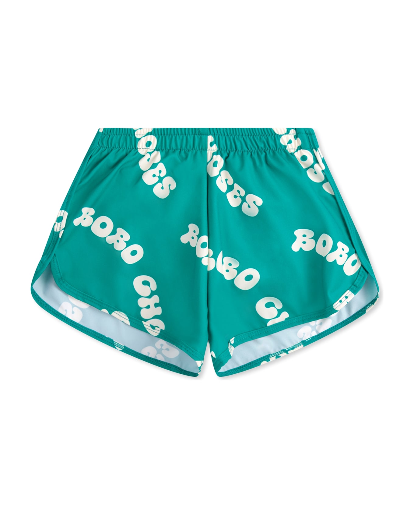 Green sewim shorts, with elasticated waist. It is embellished with all-over logo.
