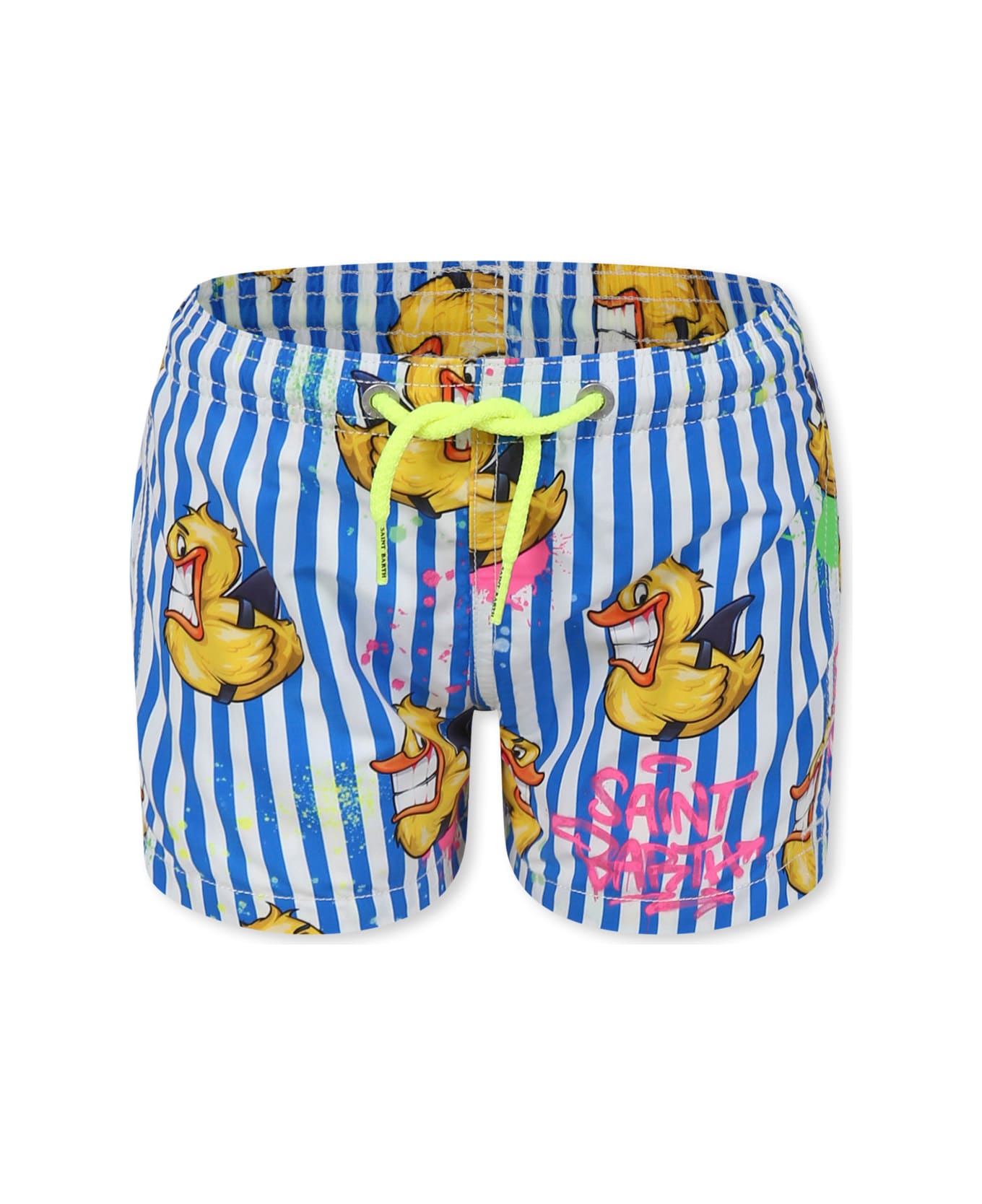 Light blue striped swim shorts with elasticated waist, drawstring, side pockets and back pocket; made of recycled polyester. They are embellished with an all-over duck print and logoed patch on the back. It is a Crypto Puppets® x Mc2 Saint Barth collaboration.