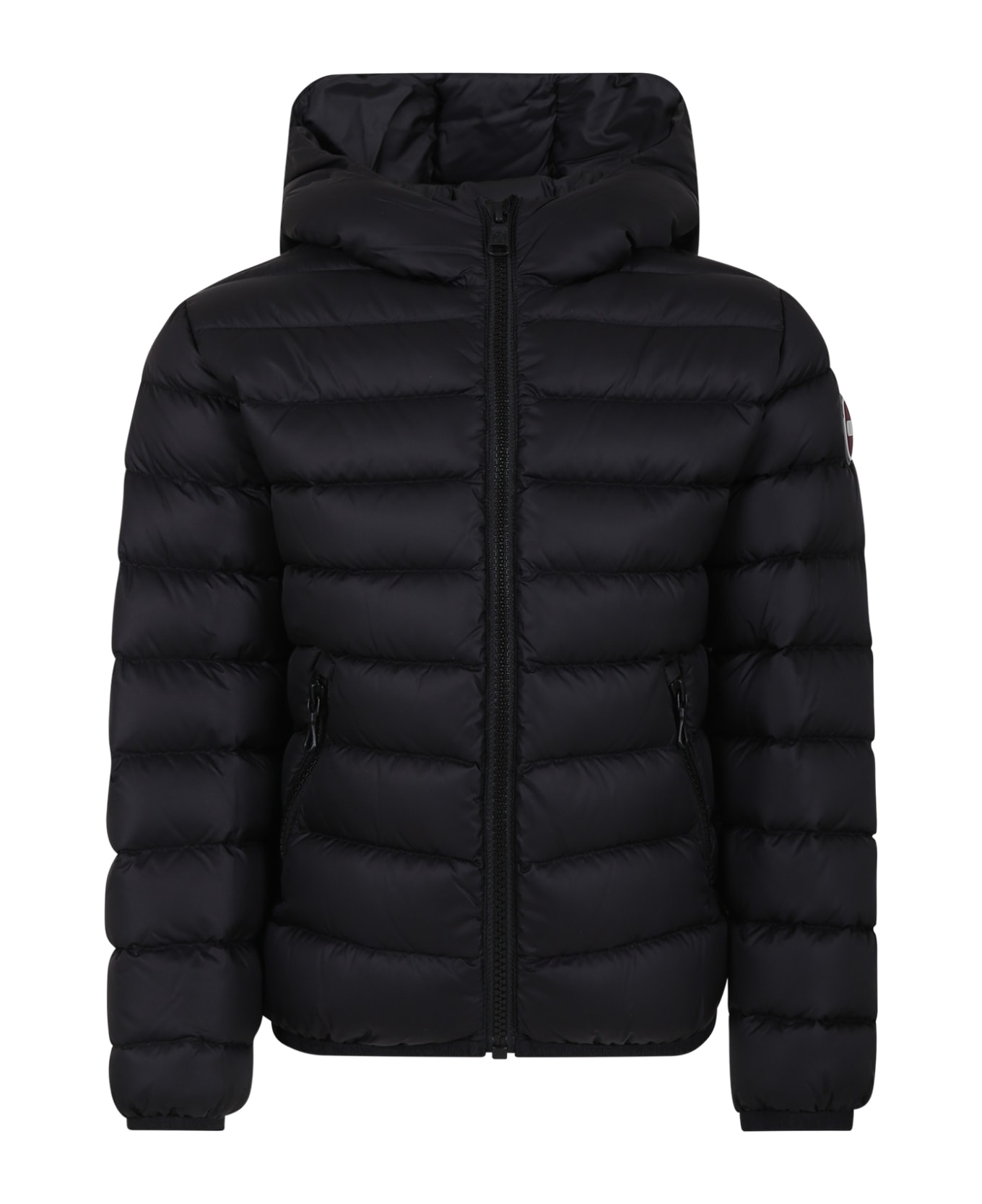 Black down jacket, padded and quilted, hood, with long sleeves with elasticated cuffs, elasticated hem, front zip closure, side pockets with zip. It is embellished with the iconic rubber logo on the sleeve and on the back.