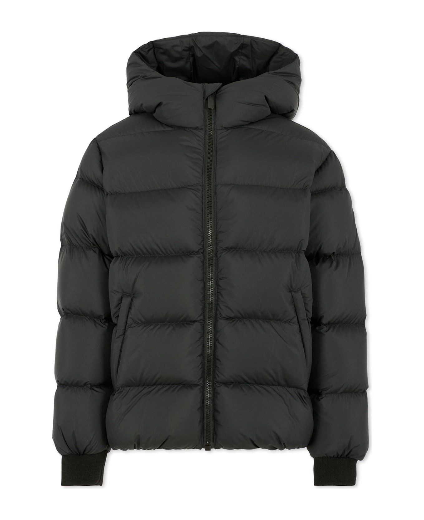 Heavyweight black quilted down jacket with long sleeves, a hood, a front zip fastening, side zip pockets, ribbed cuffs, and an elasticated hem. It is embellished with a logo patch, applied on the sleeve.