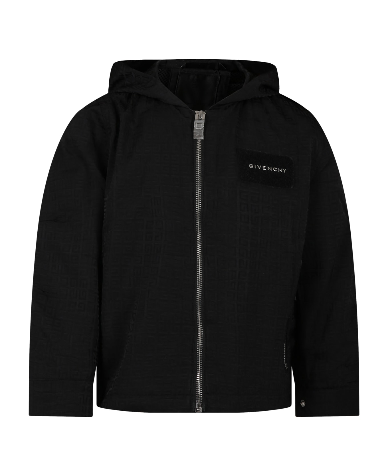 Black jacket, water repellent, in light fabric, with long sleeves, hood, front closure with zip, side pockets with zip. It is decorated with an all-over 4G jacquard motif and with a logo patch on the chest.