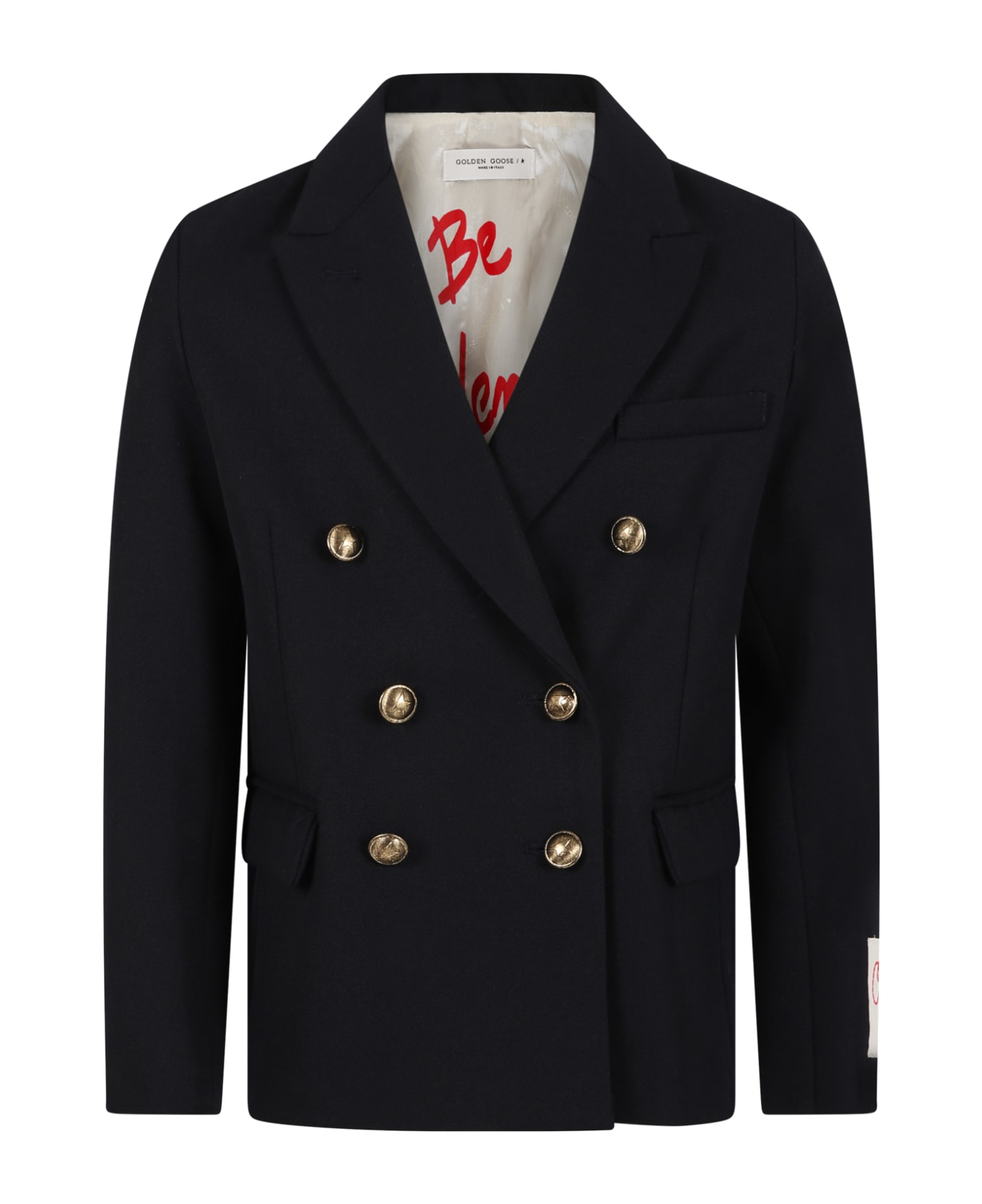 Blue jacket, with double-breasted closure, long sleeves, pockets with flap closure, on the front. It is embellished with logo patch on the sleeve and logo on the buttons.