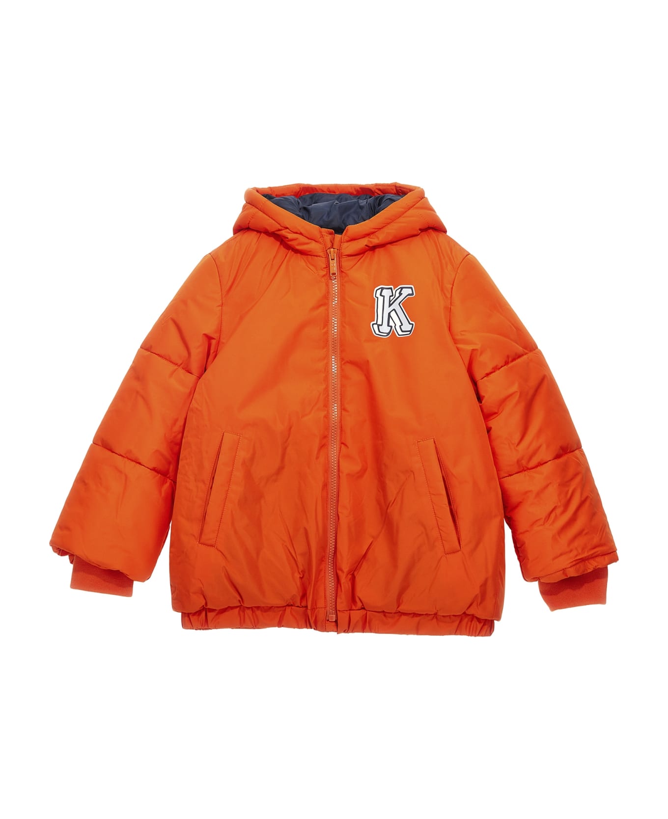 Padded nylon down jacket, source and back logo print, hood, zip closure, pockets, long sleeves with knitted cuffs, and elastic hem. Composition: 100% polyester