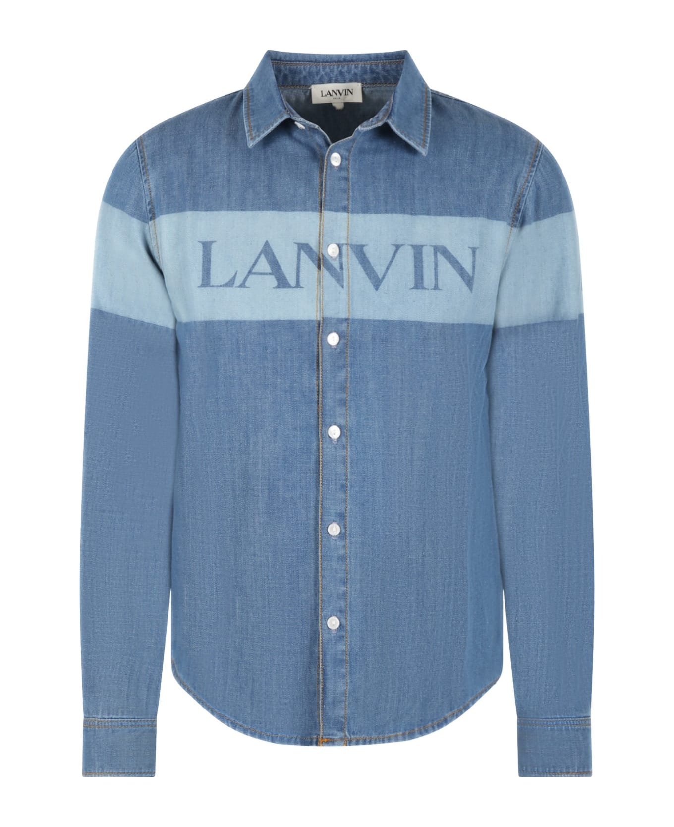Camicia celeste denim con maniche lunghe, colletto classico, chiusura con bottoni sulla parte anteriore e sui polsini. È decorata con logo sulla parte anteriore.
