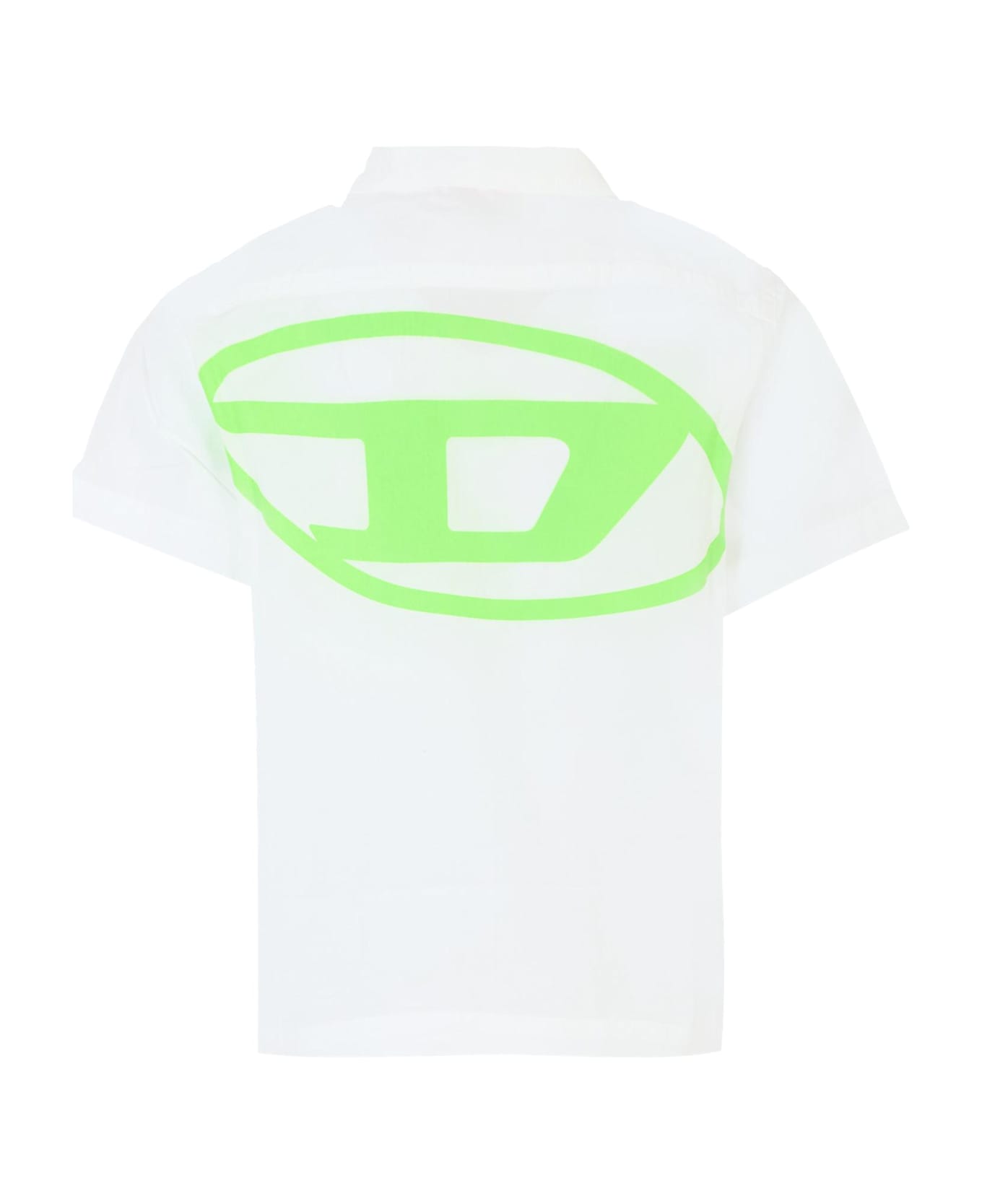 White cotton shirt, with short sleeves, a pointed collar, and a button-up front. It is embellished with a fluorescent green logo on the chest and back.